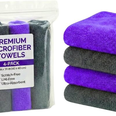 Paks – Edgeless Microfiber Towels 4-Pack – Car Detailing Wash Cloths for Cleaning – 16×16 Car Drying Towel – Lint Free Auto Rags for Polishing & Buffing – Purple & Grey Cleaning Supplies