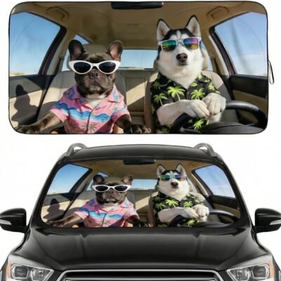 Funny Dog Car Sun Shade for Windshield – Cool Husky & French Bulldog in Hawaiian Shirts – 170T Silver Coated UV Reflector – Heat Shield for Cars, SUVs, Trucks (Standard(63″x31.5″ / 160cm x 80cm))