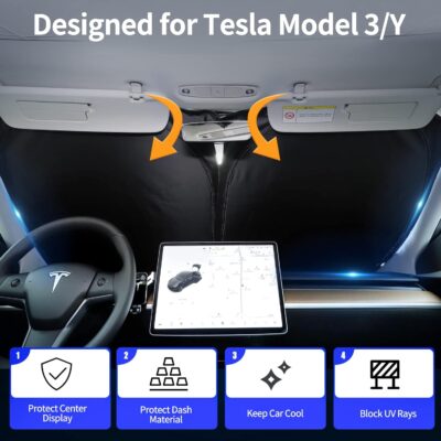 Tesla Windshield Sun Shade for Model 3 and Y – Size (56″ x 36″), Premium 240T Reflective Sunshade, Heat Shield, UV Protection Foldable Front Window Sunshade with Storage Pouch Tesla Car Accessories