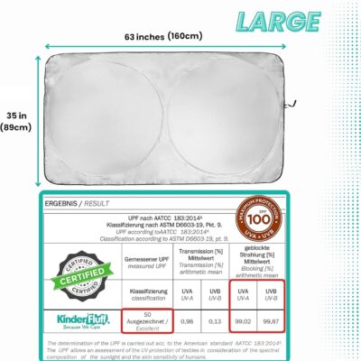 Windshield Sun Shade – Certified 99.87% UVB & 99.02% UVA Protection Car Sun Shade. Award Winning Sunshade for Car Windshield with Patented Technology. Size L 63″x35″ Car Window Shades by Kinder Fluff
