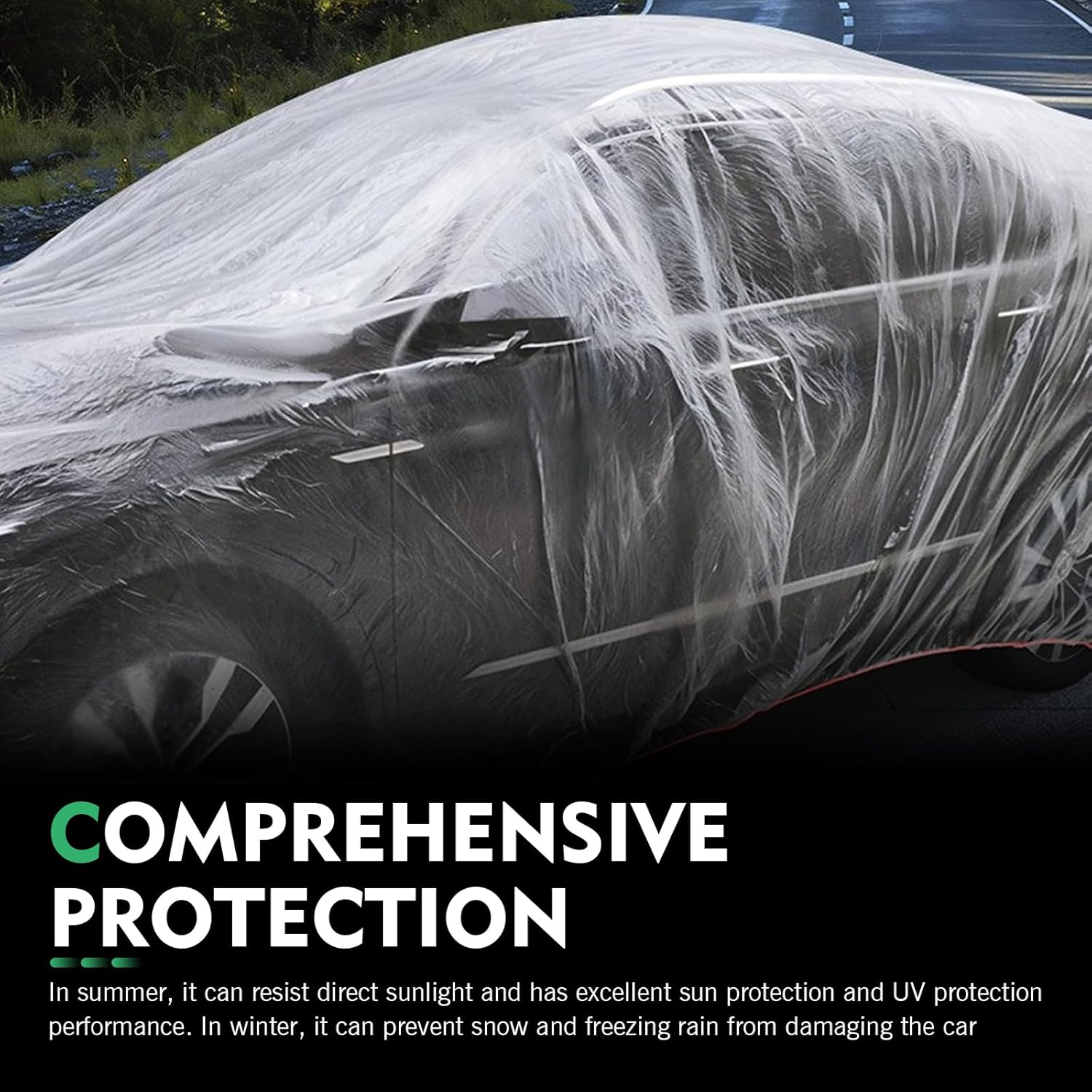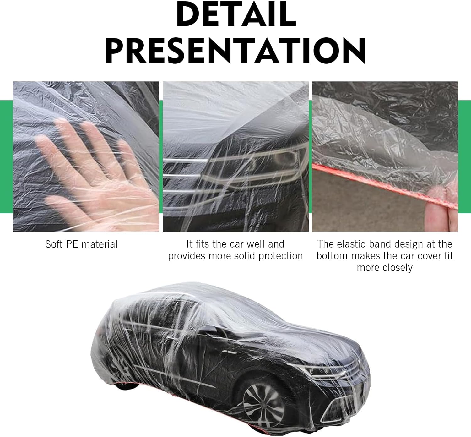 Crystal Clear Full Protection: This disposable car cover is made of transparent plastic, allowing your vehicle’s color and style to remain fully visible while being shielded. The clear design ensures quick identification and adds a sleek, non-obtrusive layer of defense.