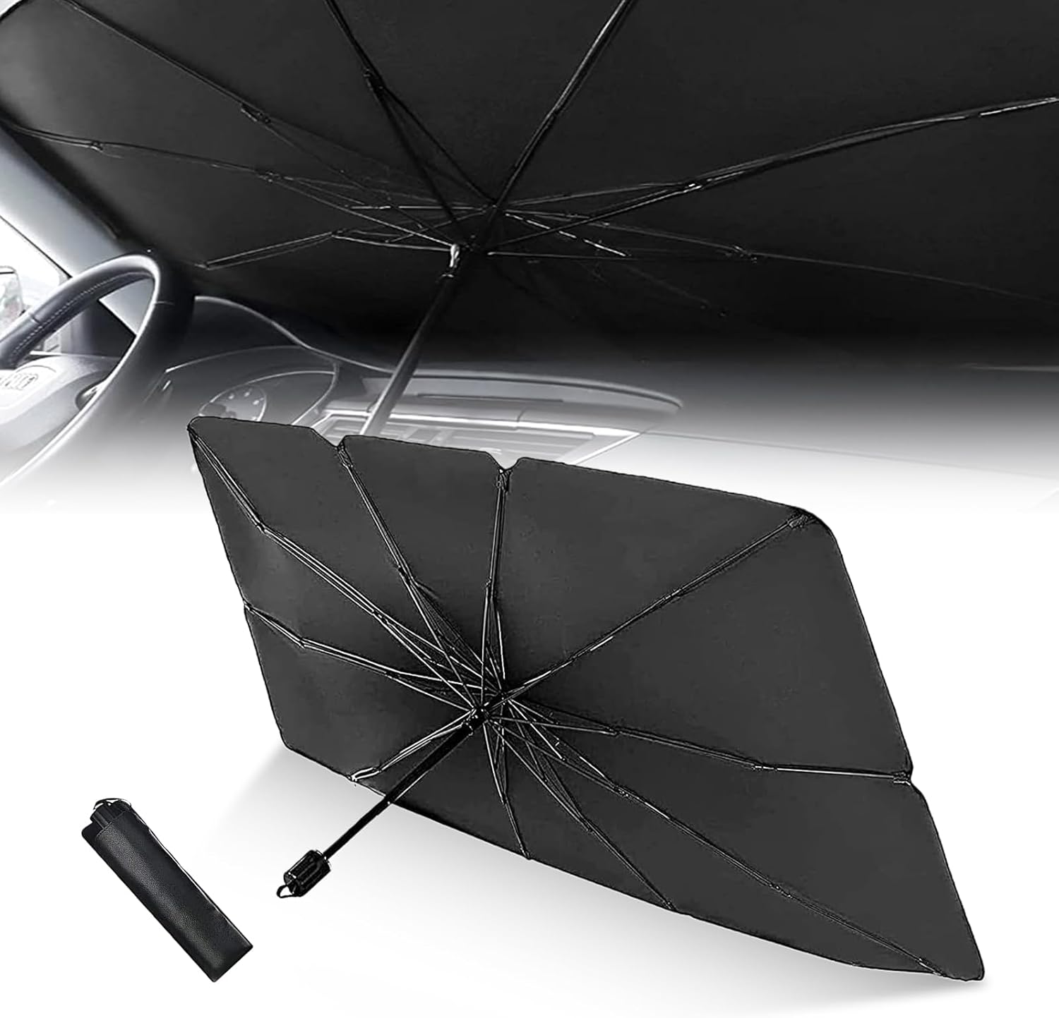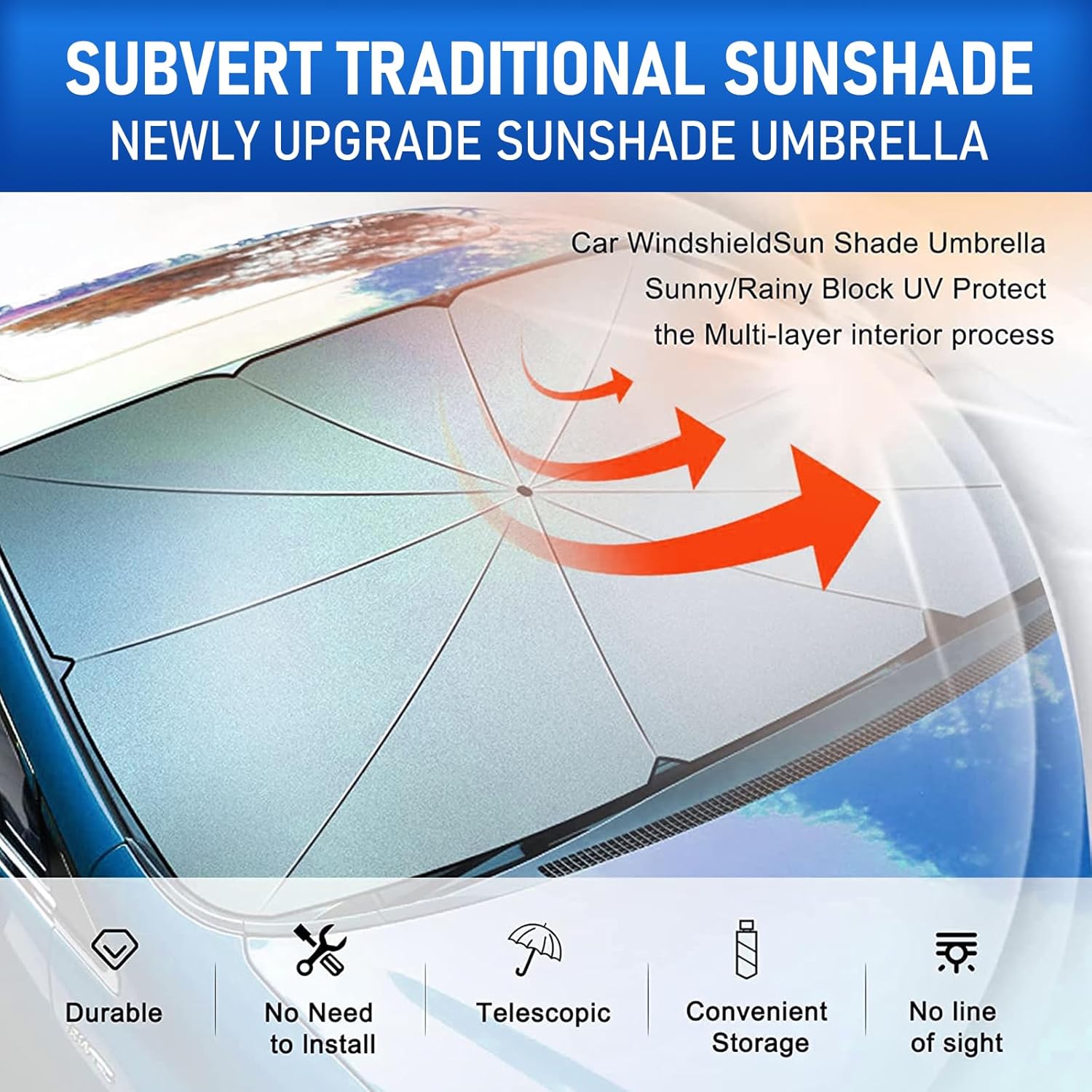 Universal Size: The size of the windshield sun shade umbrella is 55 x 31 inches, fits most standard cars, trucks, SUVs and mid-size cars. It can ensure maximum coverage for your vehicle. Please measure your automotive windshield before purchasing.