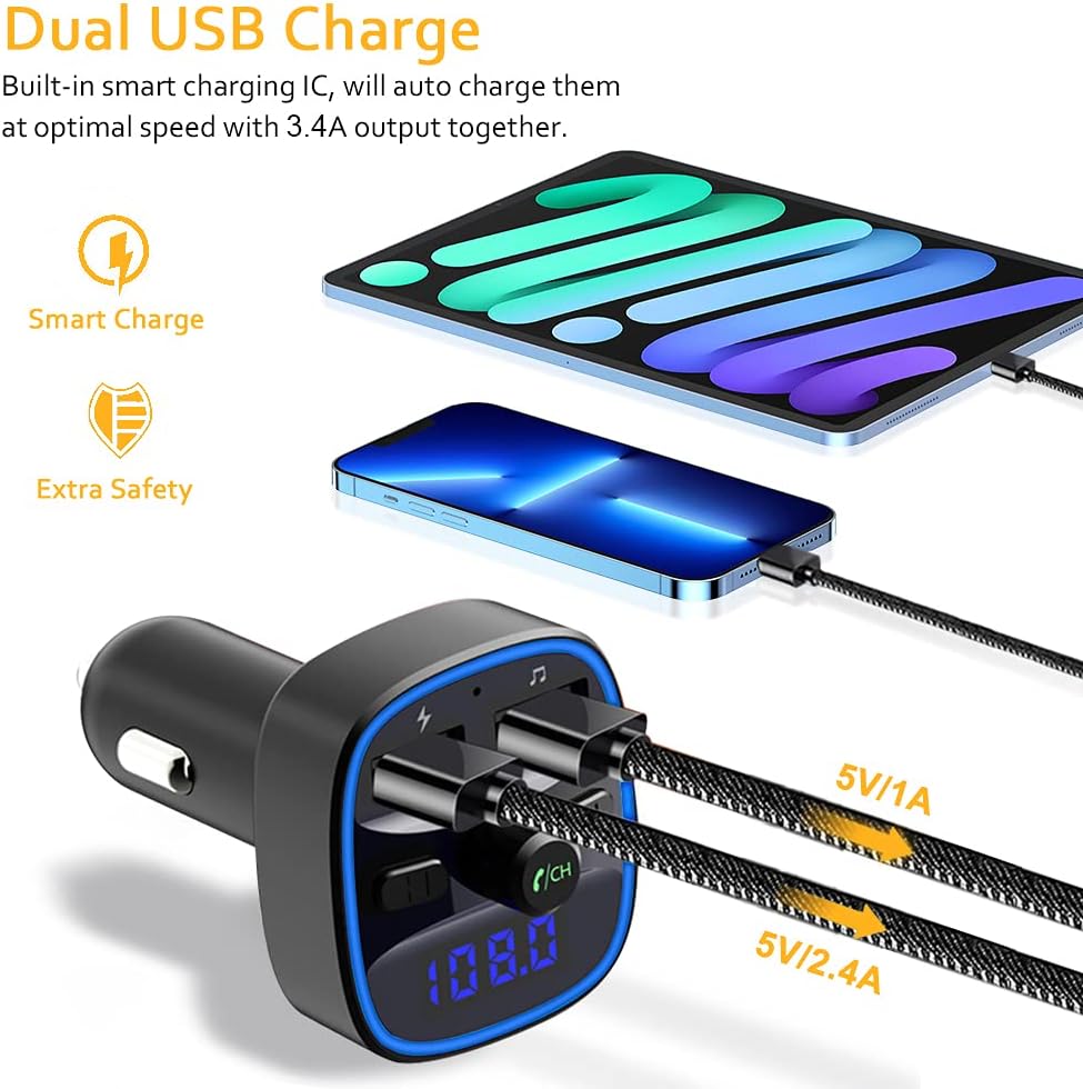 Bluetooth FM Transmitter for Car, Blue Ambient Ring Light Wireless Radio Car Receiver Adapter Kit with Hands-Free Calling, Dual USB Charger 5V/2.4A and 1A, Support SD Card, USB Disk (Black)