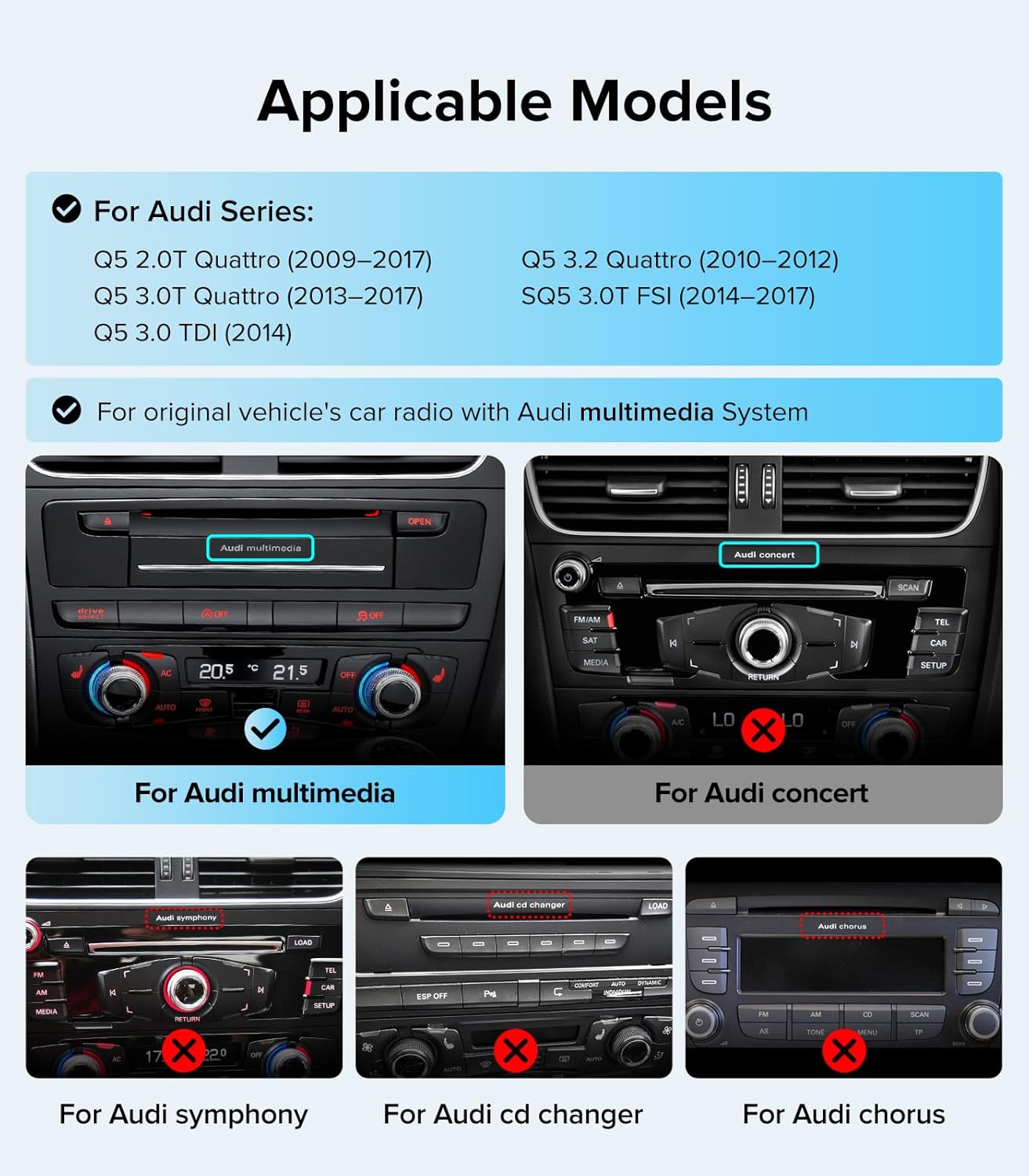 【CRITICAL: Fits Audi MMI 3G System ONLY】 Engineered specifically for Audi Q5 / SQ5 (2009–2017) equipped with the Multimedia MMI 3G system. Key Identifier: Your main control knob MUST be located on the gear shift console. DOES NOT FIT Concert/Symphony systems. Please verify your console layout before purchase