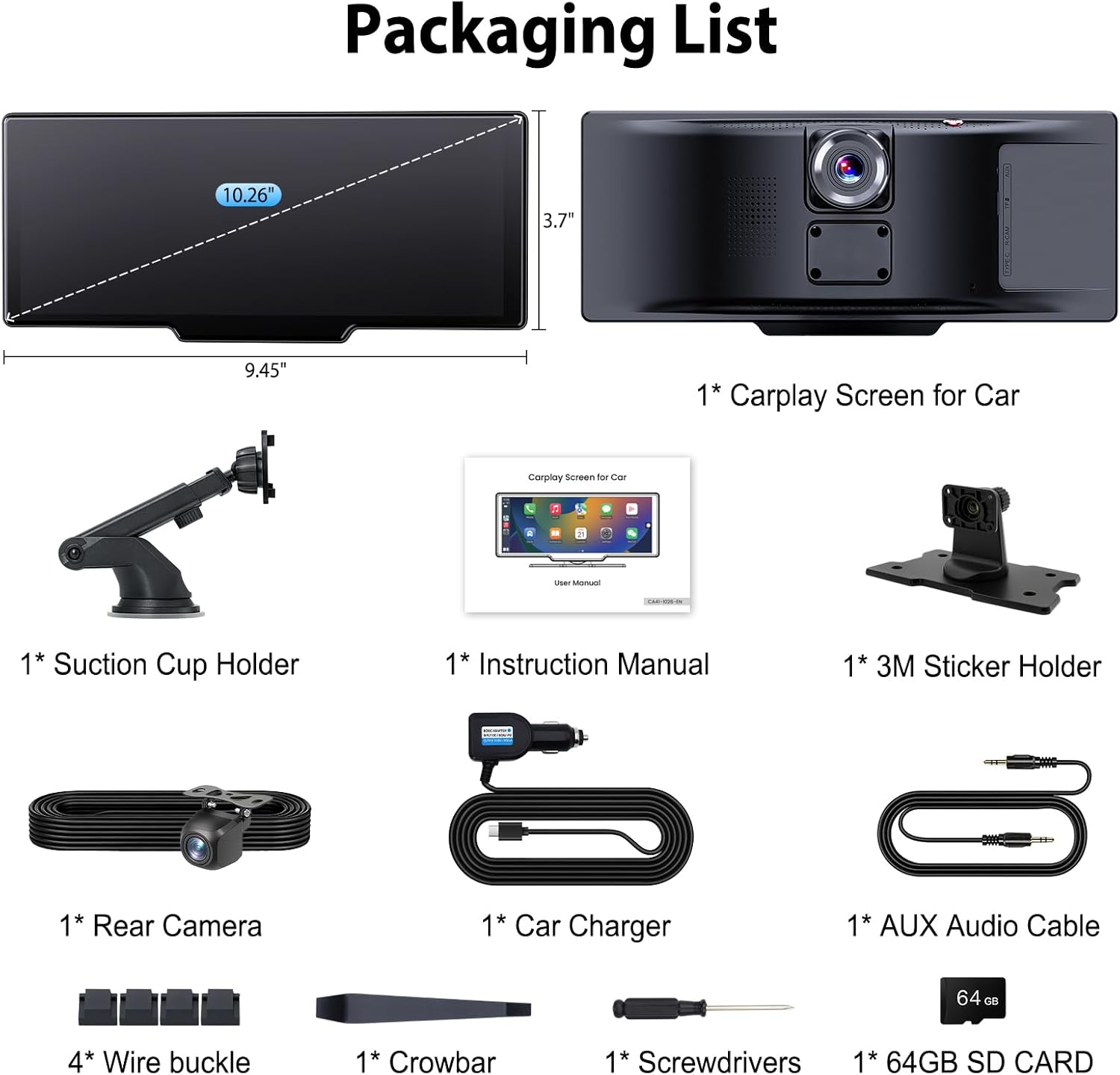10.26″ Wireless CarPlay Screen for Car: 4K Dash Cam & 1080P Backup Camera, Portable Touchscreen Car Stereo for Apple Carplay & Android Auto, GPS Navigation, Mirror Link, BT, FM, Voice Control