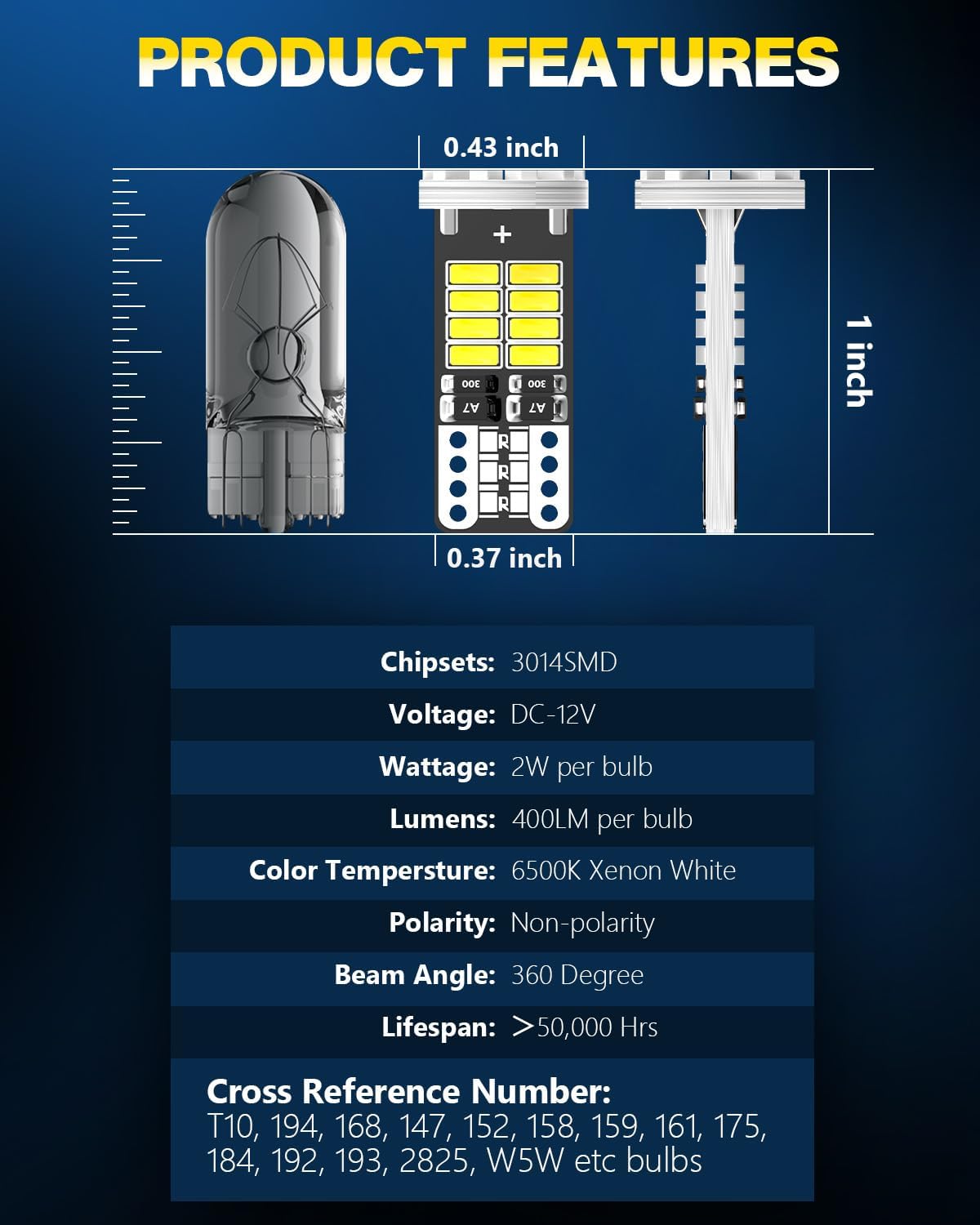 【300% Brightness Increase】: Each pack includes 10 T10/194/168 LED bulbs, each equipped with 25 pieces of 3014 SMD LED chips. They provide a color temperature of 6500K (xenon white), operate at 12V with a power consumption of 2W per bulb, and produce a lumen output of 400lm per bulb, resulting in a 300% increase in brightness. They offer 360°full-angle illumination with no blind spots, ensuring clearer visibility at night.