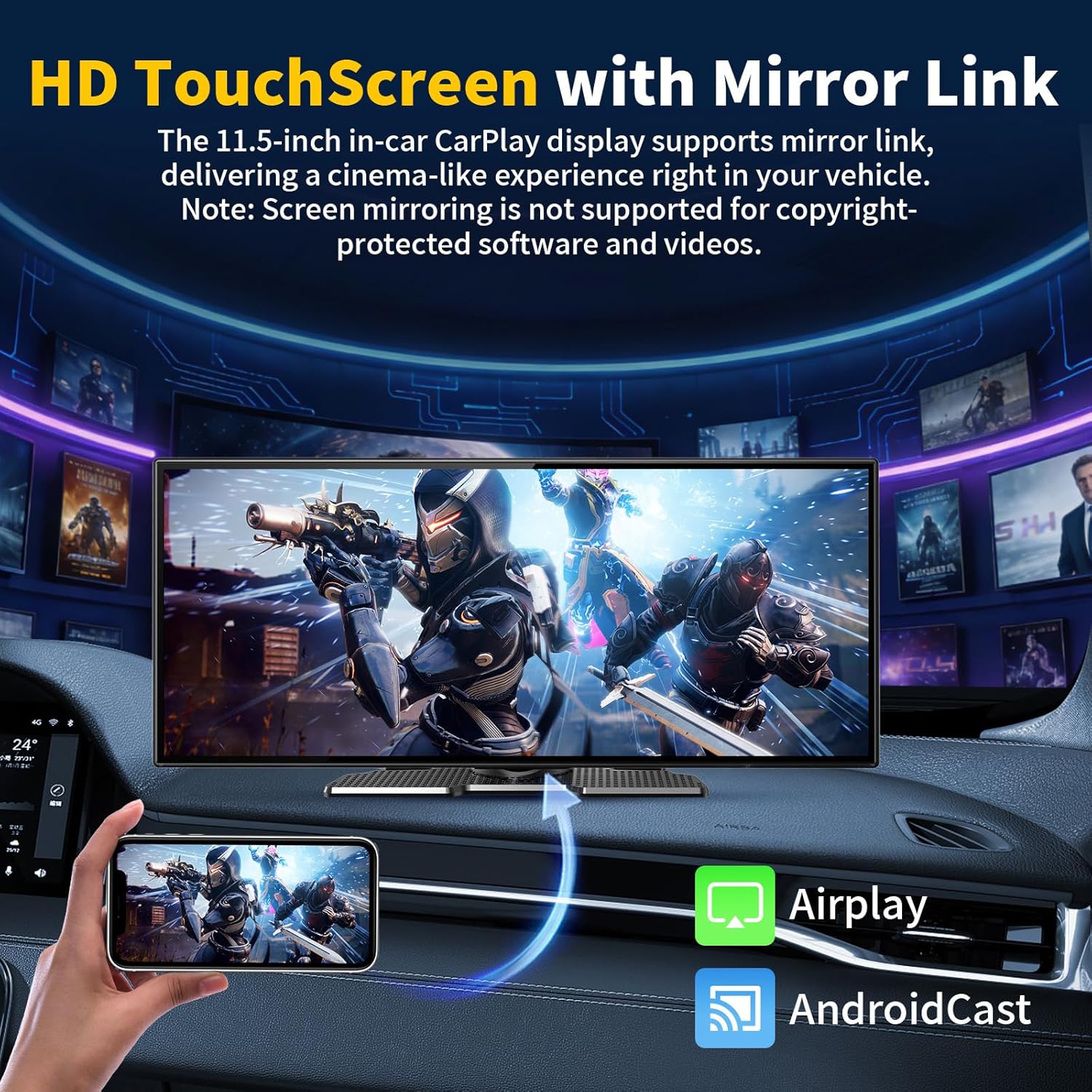 【11.5″Extra-Large Touch Screen】This a pple carplay screen for car measures 11.5 inches (1920 x 720). The lower height and wider carplay screen provide a better view while driving, making it easy to view navigation and videos and improving driving safety. The IPS HD screen has a wide viewing angle and high color reproduction, providing clearer images and easier access to driving information for more convenient driving.