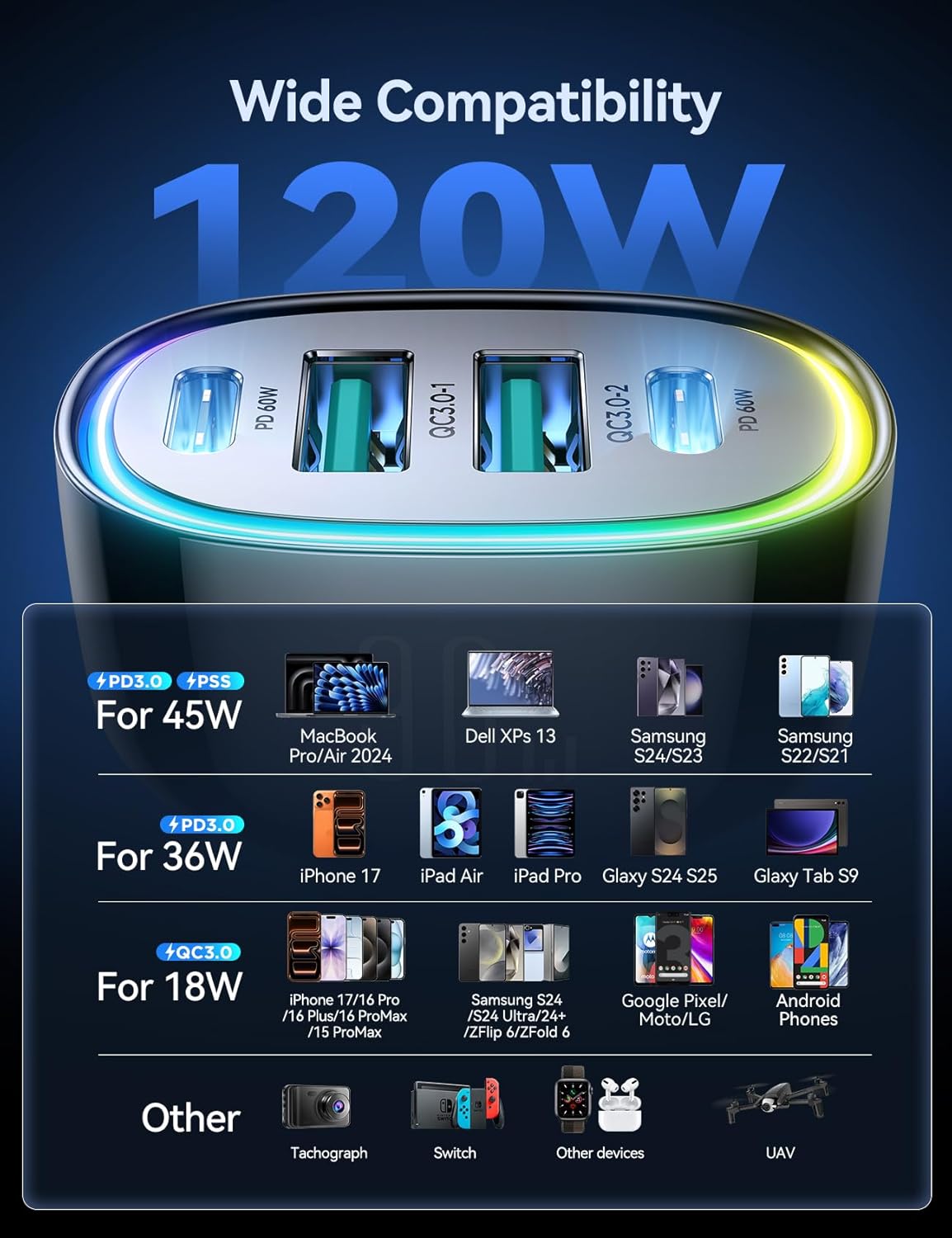 Universal Multi-Protocol Compatibility – Go beyond standard fast charging! 120W usb c car charger is support the latest PPS protocol for Samsung Galaxy S26/S25/S24/S23/S22/S21 Ultra fast charging. Also fully compatible with PD3.0, QC3.0, AFC, FCP, SCP and more. Safely and efficiently fast charge iPhone 17/17 Pro/17 Air /16e/16/15/14/13/12 Pro Max, Google Pixel, iPads, Macbook air and most devices.