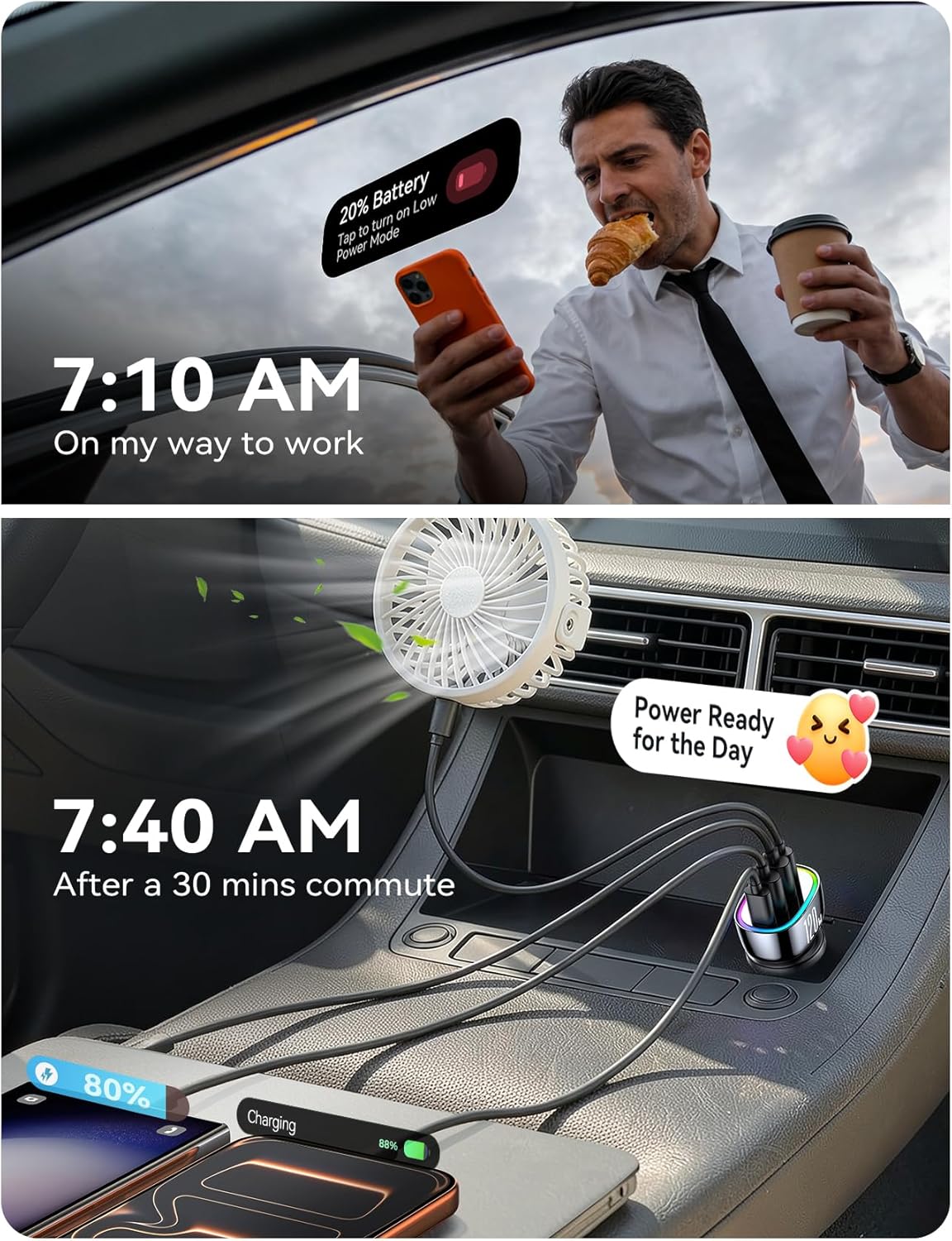 Perfect Car Accessories for Truck Drivers – A must-have truck accessories for truck drivers, this 4 Port iPhone 17 Pro car charger keeps multi devices powered during long hauls. A thoughtful road trip essentials gifts for women or men always on the go. With colorful and soft charging indicator light shows that the charger is securely plugged in and is perfect brightness to prevent distractions while driving at night
