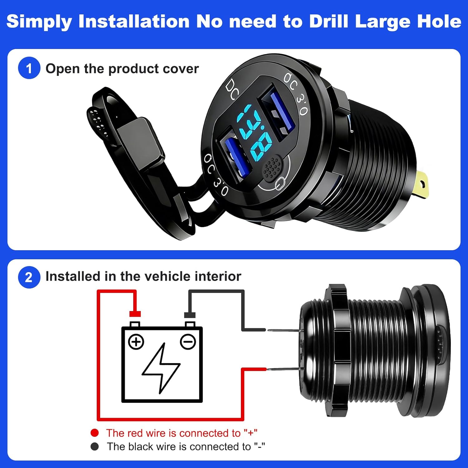 Easy DIY Installation Includes 60cm fused power cable and blue crimp terminals. Connect red wire to positive (+), black wire to negative (-). Polarity markings on bottom. Reverse connection prevents power delivery.