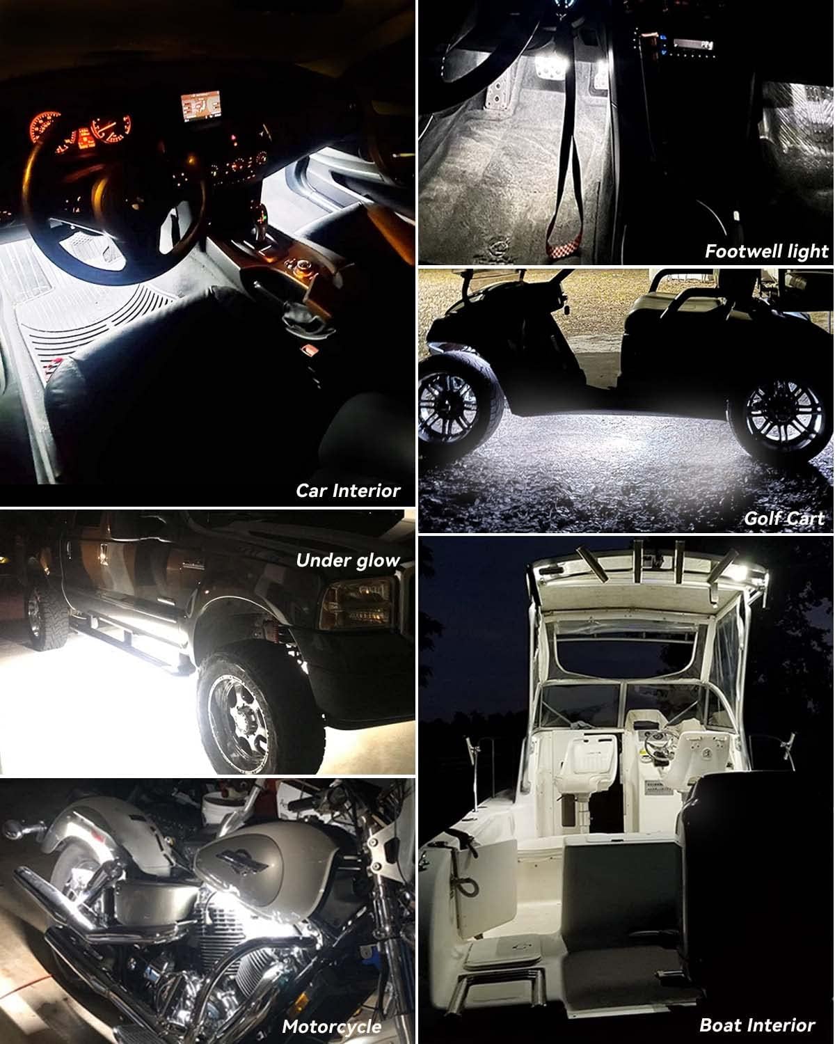 【Waterproof IP68 & Flexible】— Waterproof IP68, Flexible, UV & water resistant. Ultra thin, can be easily installed in between the gap and virtually invisible; this white led strip fits all Cars RV SUV vans trucks boats marine interior light strip with DC 12V power