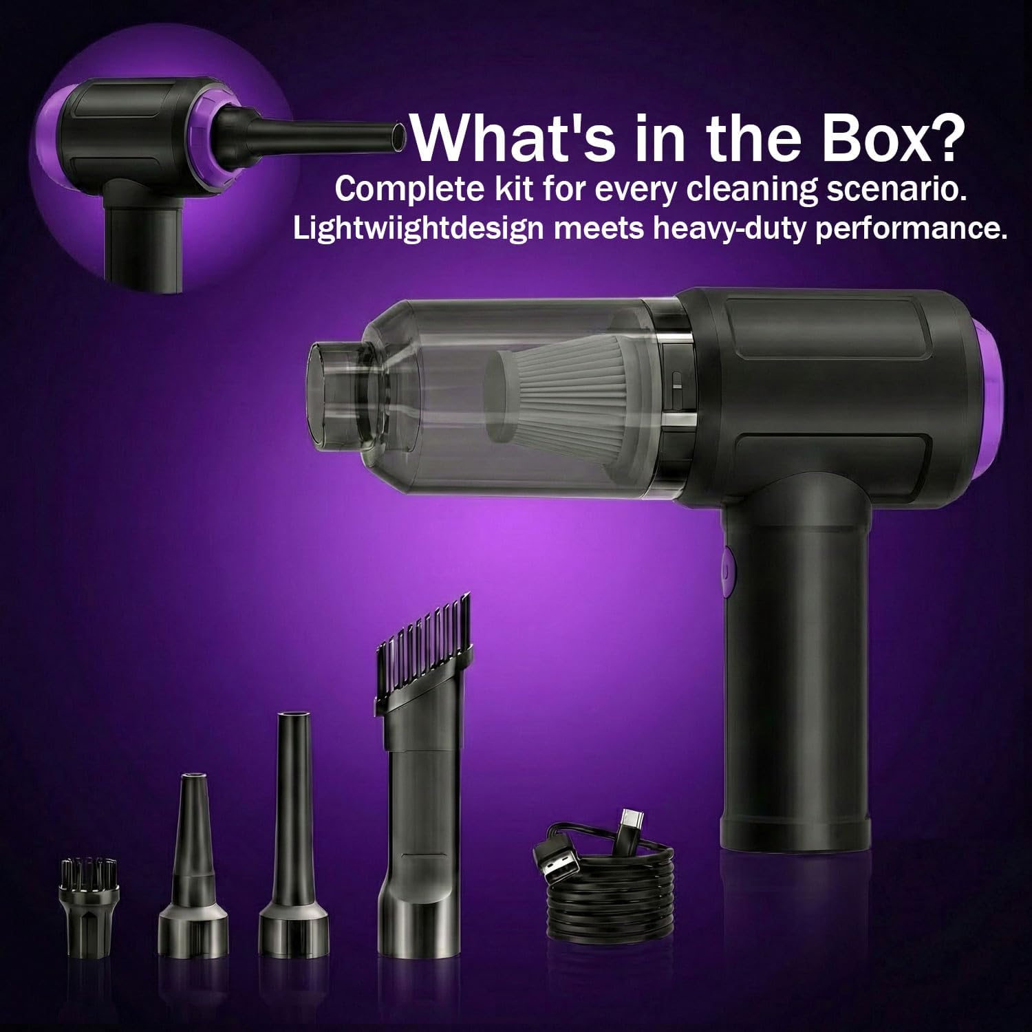 🛠️ Innovative 3-in-1 Design (Blower, Vacuum & Pump): More than just a cleaner. 1. Air Duster: Cleans camera lenses, servers, and LEGO models. 2. Handheld Vacuum: Perfect for car interiors, sofas, and office desks. 3. Vacuum Pump: Use the tail end to suck air out of storage bags, saving luggage space for travel. Includes 6+ nozzle attachments for any scenario.