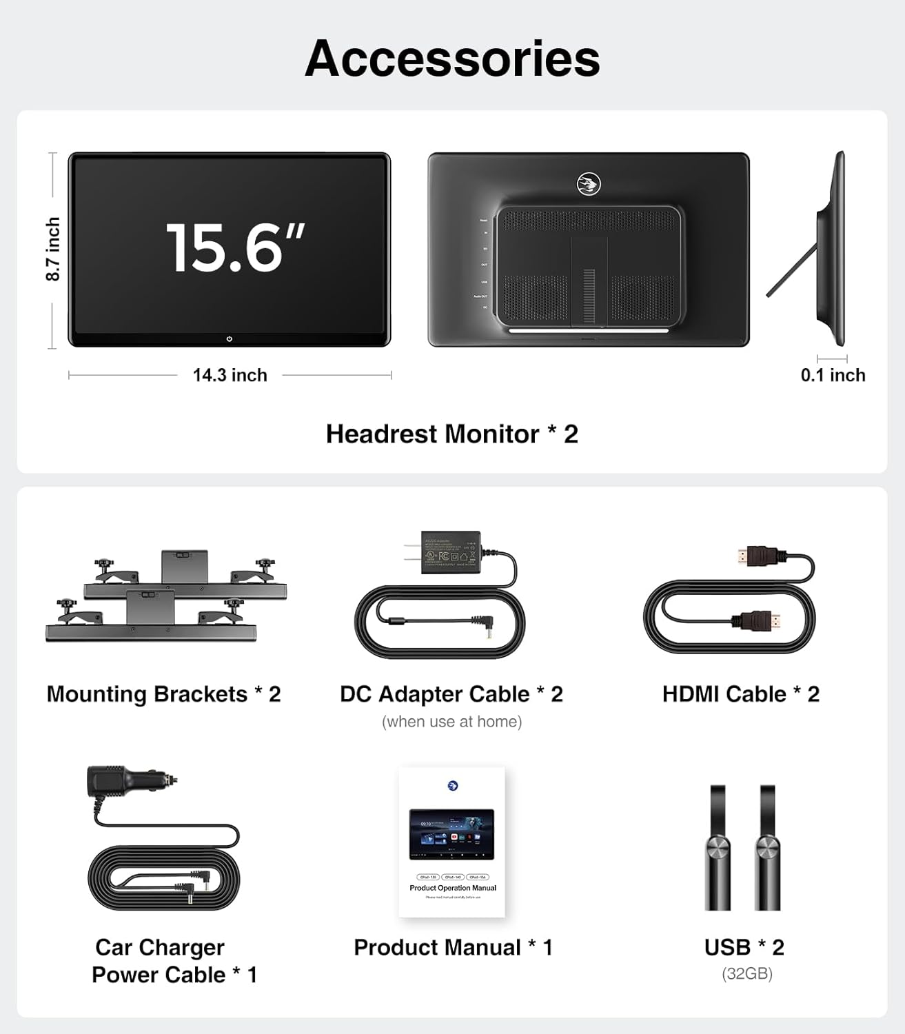 This is more of an unboxing than a review, but I wanted to show you what comes in the box when you order this outstanding entertainment system. It is very well packaged, and nothing was broken. The TWO screens are bigger than I thought they would be.I really like how they send plugs so you can use these in the car or at home.Be sure and measure your head rest poles if you plan to use the included mounts. The round poles must be between 5.5 inches and 7.5 inches to work.