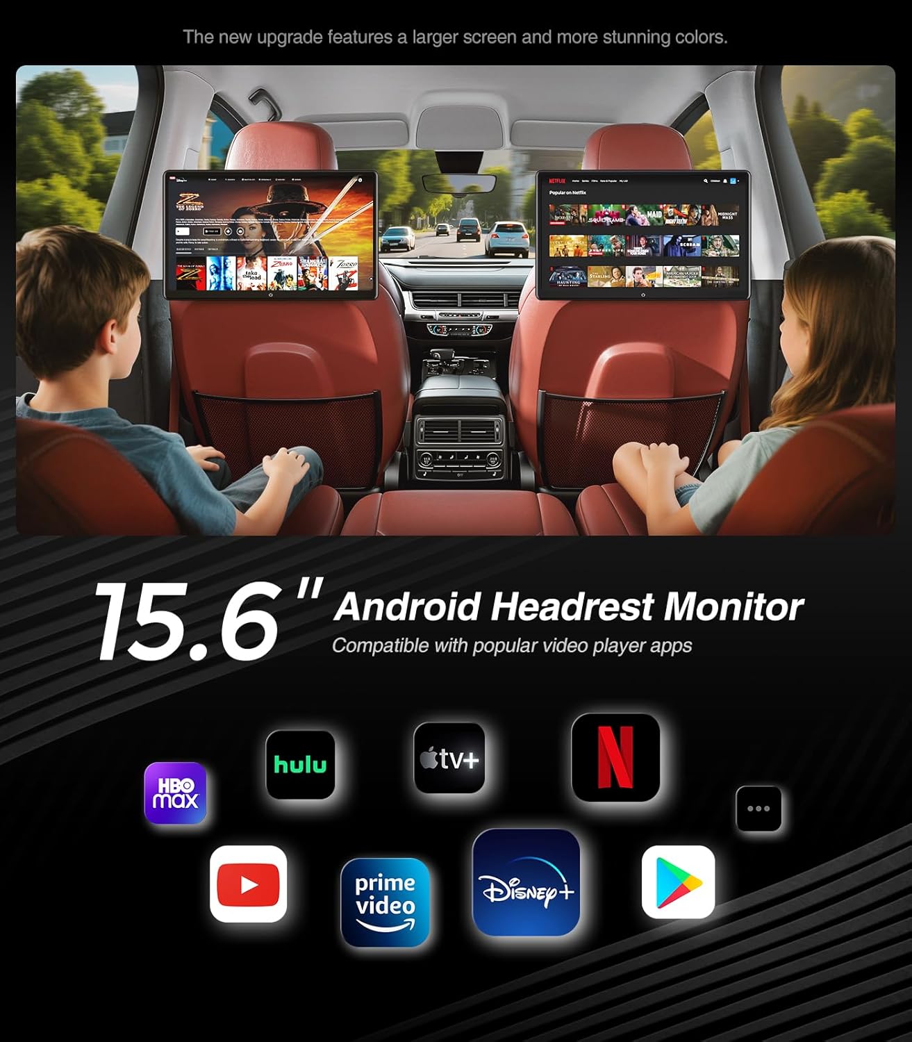 I was blown away by this Android 13 dual headrest monitor arrangement. The 15.6-inch full HD panels are enormous and incredibly clear, and the touch responsiveness is incredibly fluid. The system was simple to set up, and I was astonished by how rapidly the programs loaded. You could add everything from Disney+ to Netflix to YouTube. When traveling long distances with children, wireless screen mirroring is revolutionary. When two children wish to view separate content, it is nice that both screens can function independently. Additionally, the sleek, contemporary style blends in flawlessly with our vehicle. Fortunately, all the pieces were still in place and they were in good condition when they came. If you understand what I mean, which I am sure you do, the instructions were clear and easy to follow, making installation a breeze. The screen has stunning colors and is quite bright. The sound quality is superb. I am rather pleased with these. They look fantastic. They are quite effective. Outstanding value for the money. You truly get what you pay for, people. The universal mount is compatible with the majority of automobiles, and installation is simple. Both displays support well-known programs like Netflix, YouTube, and Disney+, boot up fast, and do not lag. Even Samsung phones have good mirroring capabilities. This is an excellent backseat entertainment system because of its vivid, high-resolution display and superb audio quality. The visual quality is clear and sharp, and the touchscreen is incredibly responsive. With phone mirroring, HDMI capability, and a wide selection of media via WiFi, SD card, and USB, it is ideal for entertaining passengers. The visual quality is clear and sharp, and the touchscreen is incredibly responsive. With phone mirroring, HDMI capability, and a wide selection of media via WiFi, SD card, and USB, it is ideal for entertaining passengers.