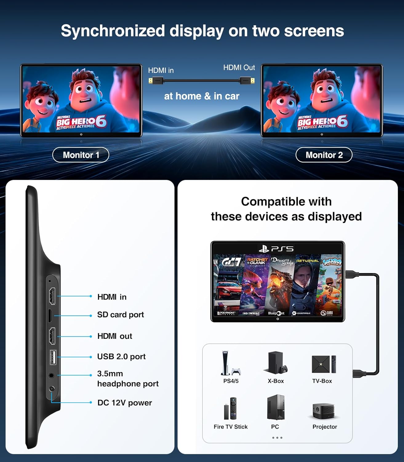 This car tv has both HDMI input and HDMI output function, using HDMI cables to make 2 monitors to play the same movie at the same time. The HDMI input function can be connected to Computer, tv box ,Xbox, PS4, PS5 and other devices to sync the video playing.