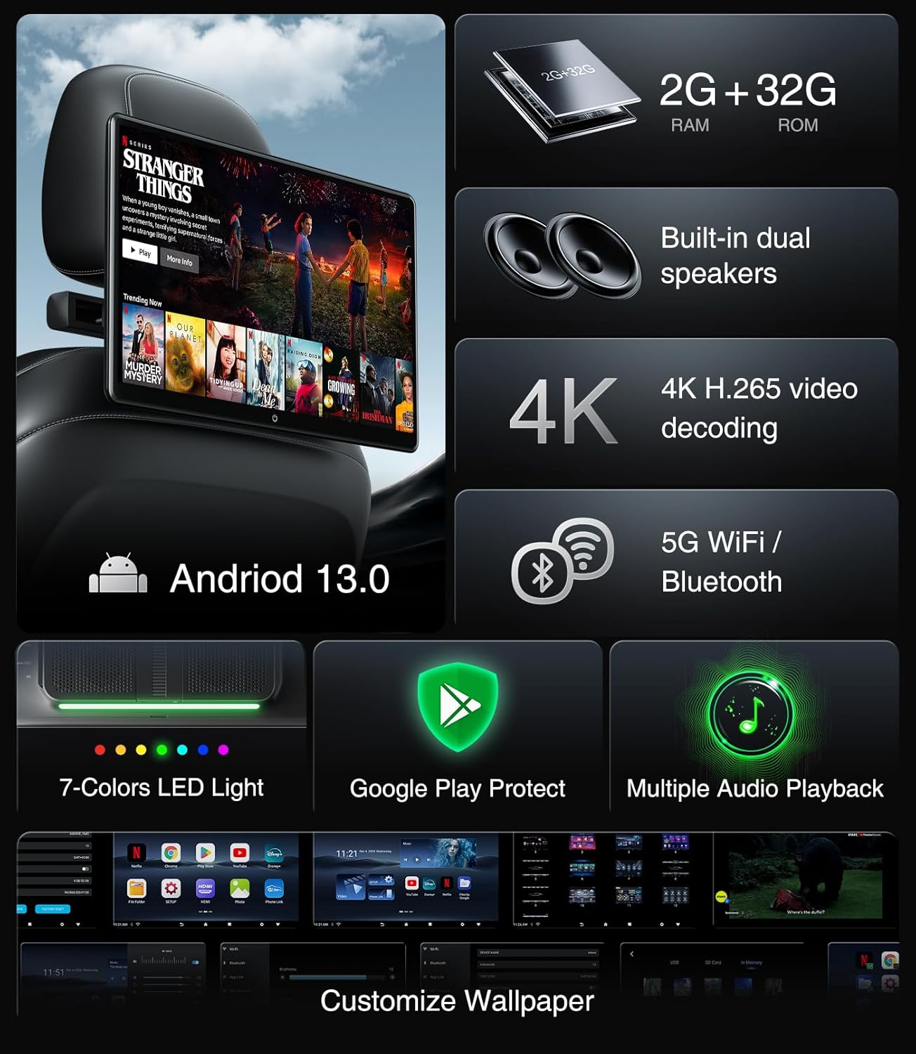 2025 New Upgraded Car TV:Upgrade to Cortex A55 CPU, Android 13.Android headrest monitor supports all mobile phone’s(included for Sam-sung) connectivity via Happycast.This android car tv supports download and update apps through the Goo-gle Play store.It is also certified by Goo-gle play protect.You can install the apps from goo-gle play store safely. You can set customize wallpaper ,giving you more personalized options