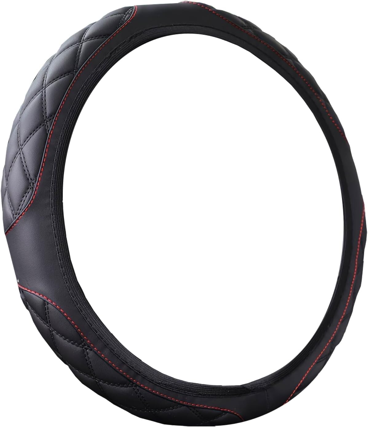 I love adding a touch of blue in my car’s black interior to match the blue exterior, and the blue on this steering wheel cover is beautiful and bright. The quilted stitching on the synthetic leather feels soft and a little padded. This cover fits around my 15″ steering wheel well. In time, I have noticed that it’s shifting a little like it may be stretching. I would like it a little tighter