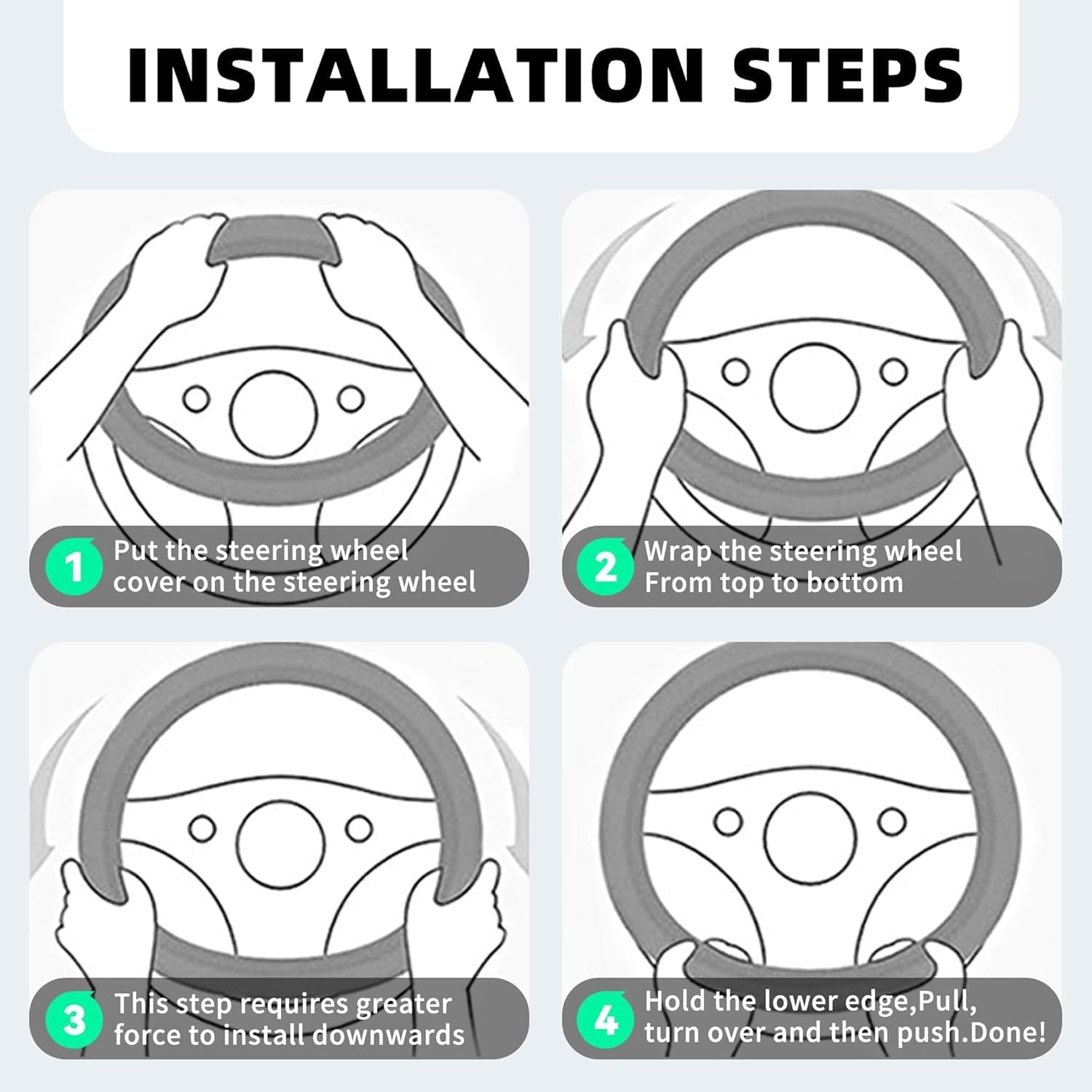 【Easy Installation】: Installation is straightforward. Simply place the cover over the steering wheel, press down firmly on the top with both hands, and gently pull it down from both sides to secure it.