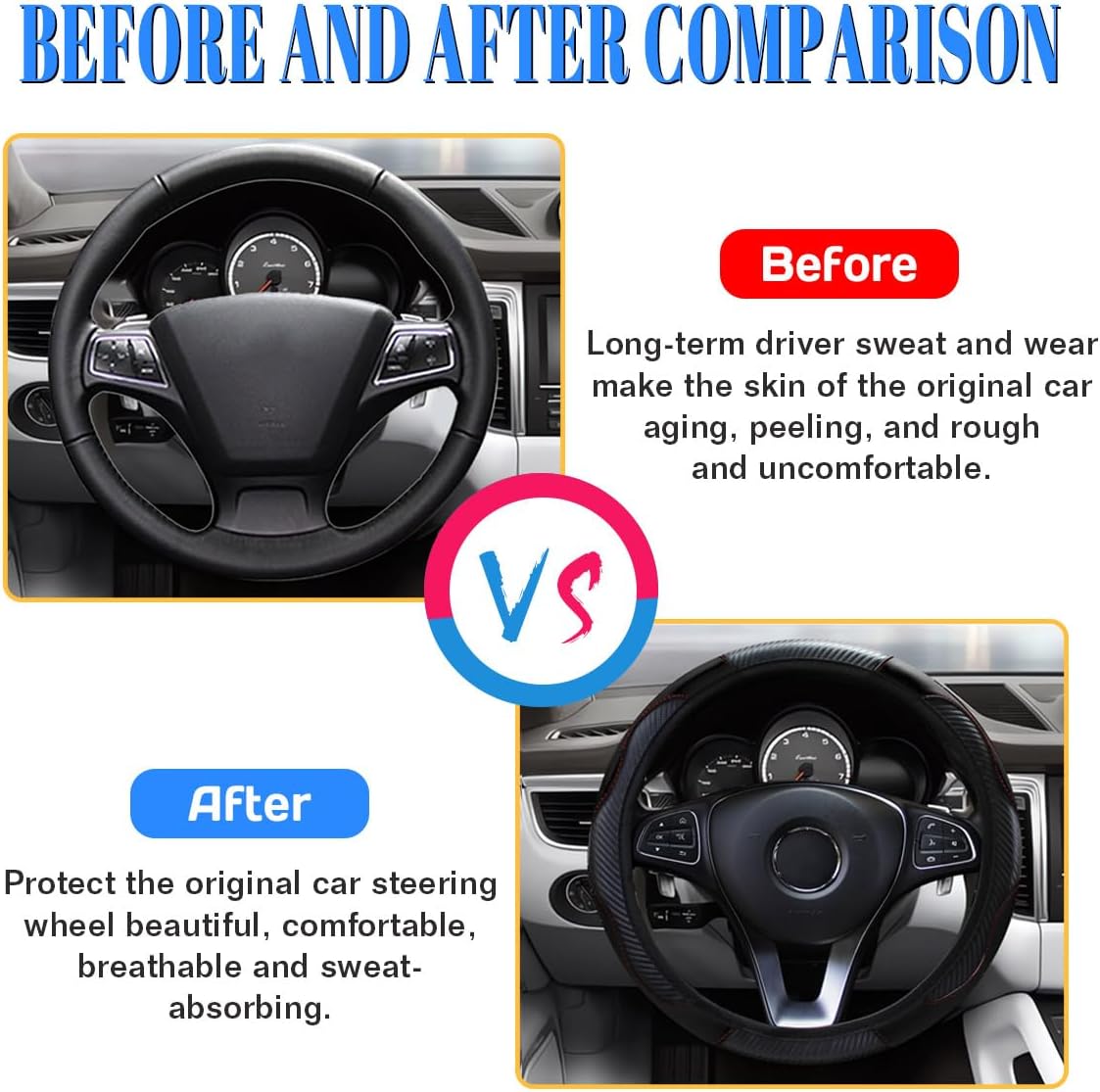The Car Steering Wheel Cover, designed for 15-inch wheels, is a fantastic upgrade that combines style, comfort, and functionality. With its anti-slip features, carbon fiber aesthetics, and microfiber PU leather, this cover enhances both the look and feel of your steering wheel. Here’s a detailed review of its performance and features:Sleek and Modern Design: The cover’s carbon fiber and microfiber PU leather design give it a sleek, modern appearance that adds a touch of sophistication to any vehicle’s interior. The black finish is versatile and complements a variety of car interiors, making it an attractive accessory that elevates the look of your steering wheel. The carbon fiber texture also provides a sporty, high-tech feel.Enhanced Grip and Anti-Slip Performance: One of the standout features of this steering wheel cover is its anti-slip design. The microfiber PU leather provides a secure grip, reducing the chances of your hands slipping during driving, especially in wet or humid conditions. This feature enhances driving safety and ensures a more controlled steering experience. The textured surface also adds comfort, making it pleasant to handle.Comfort and Durability: The cover is made from high-quality PU leather and microfiber, offering a soft yet durable surface. The cushioning is just right—not too thick to interfere with steering, but enough to provide added comfort during long drives. The materials are also resistant to wear and tear, ensuring that the cover remains in good condition even with regular use.Easy Installation: Installing the cover is straightforward and hassle-free. It fits 15-inch steering wheels perfectly, and the flexible material makes it easy to slip onto the wheel. Once in place, it stays securely, without any risk of shifting or slipping. The installation process does not require any special tools or professional assistance.Improved Driving Experience: The combination of the anti-slip grip and the cushioned surface enhances overall driving comfort. The steering wheel feels more comfortable in your hands, and the added grip provides better control, making driving more enjoyable. The cover also helps to keep the steering wheel clean and protected from wear and dirt.Maintenance and Cleaning: Maintaining the cover is simple. The PU leather surface can be easily wiped clean with a damp cloth to remove any dust or spills. The durable materials resist stains and are easy to keep looking new, contributing to the overall low-maintenance nature of the cover.Overall Impressions: The 15-inch Anti-Slip Steering Wheel Cover is an excellent choice for anyone looking to upgrade their driving experience with a blend of style and practicality. Its modern carbon fiber design, combined with the functional anti-slip grip and comfort-enhancing materials, makes it a valuable addition to any vehicle. The easy installation, durability, and low-maintenance nature further add to its appeal. Whether for improving driving comfort or refreshing your car’s interior, this steering wheel cover delivers impressive performance and style. Highly recommended for both men and women who want a stylish yet functional upgrade for their steering wheel.