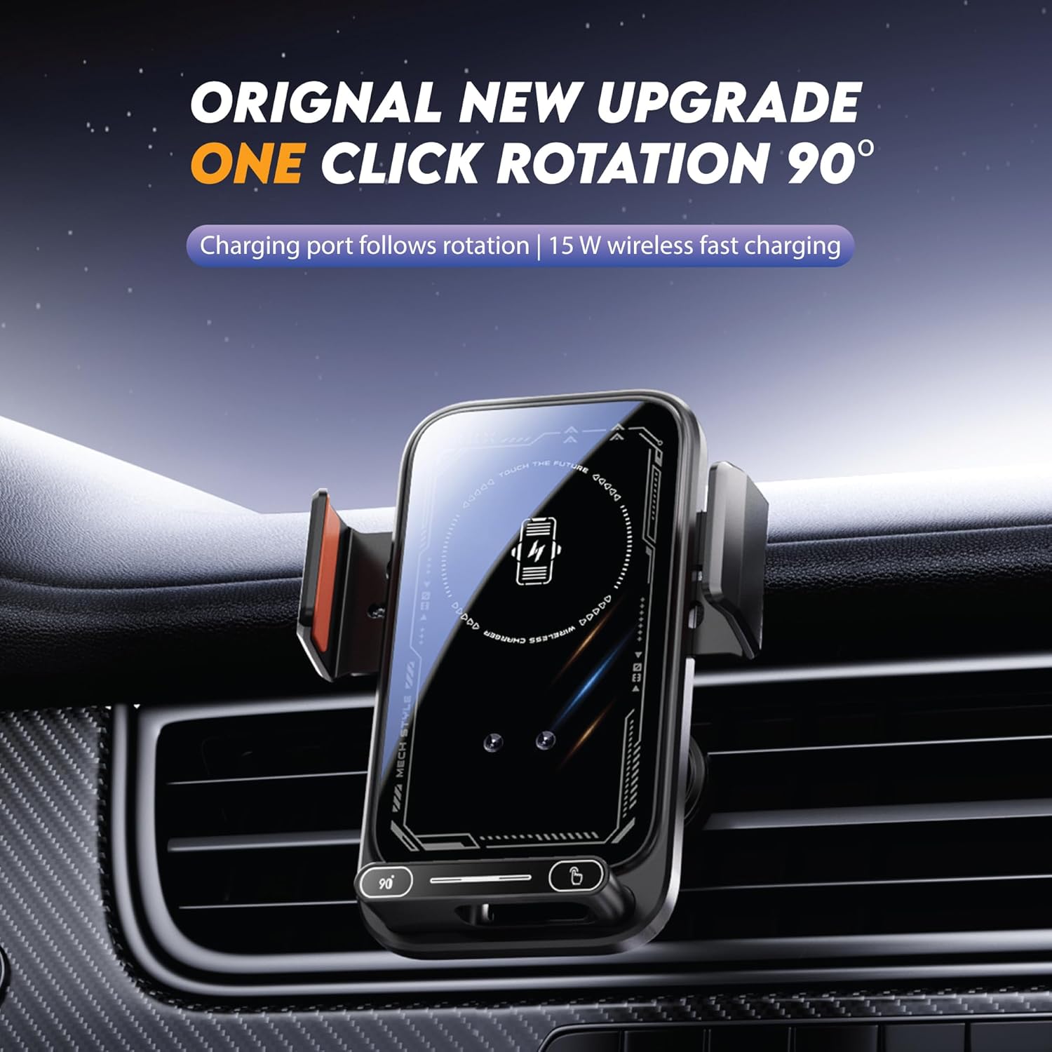 Smart rotating car phone mount with fast 15W wireless charging, auto sensor control, touch arms, built-in battery—convenient, modern, secure, and very user-friendly.