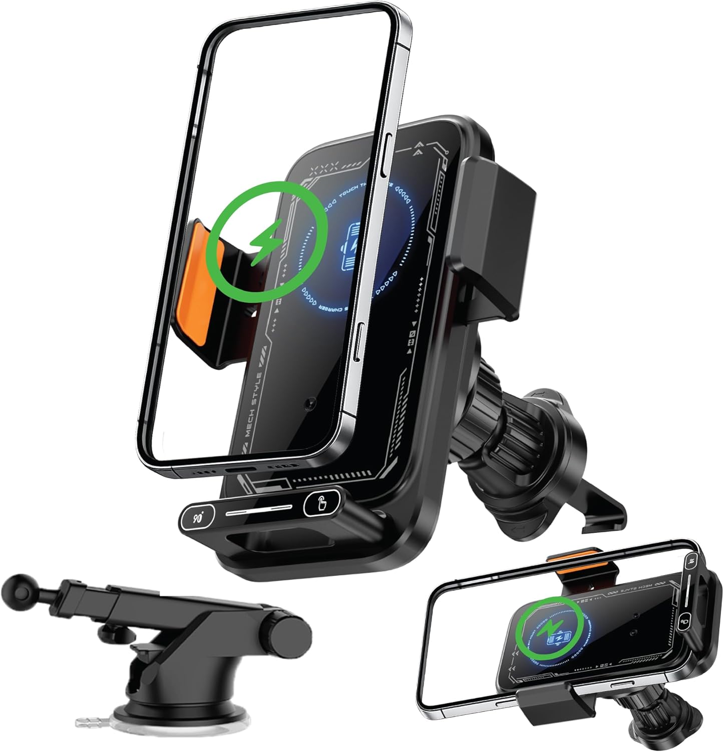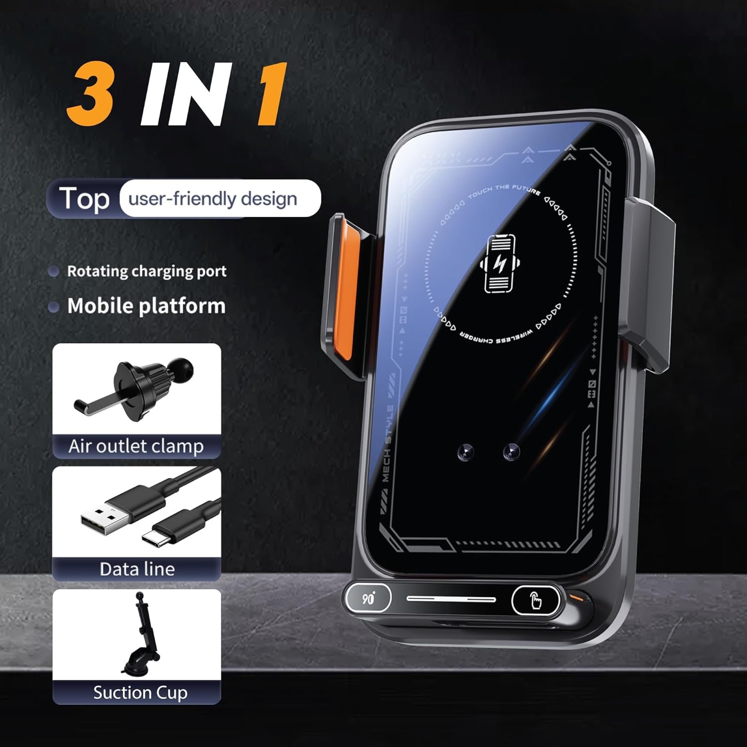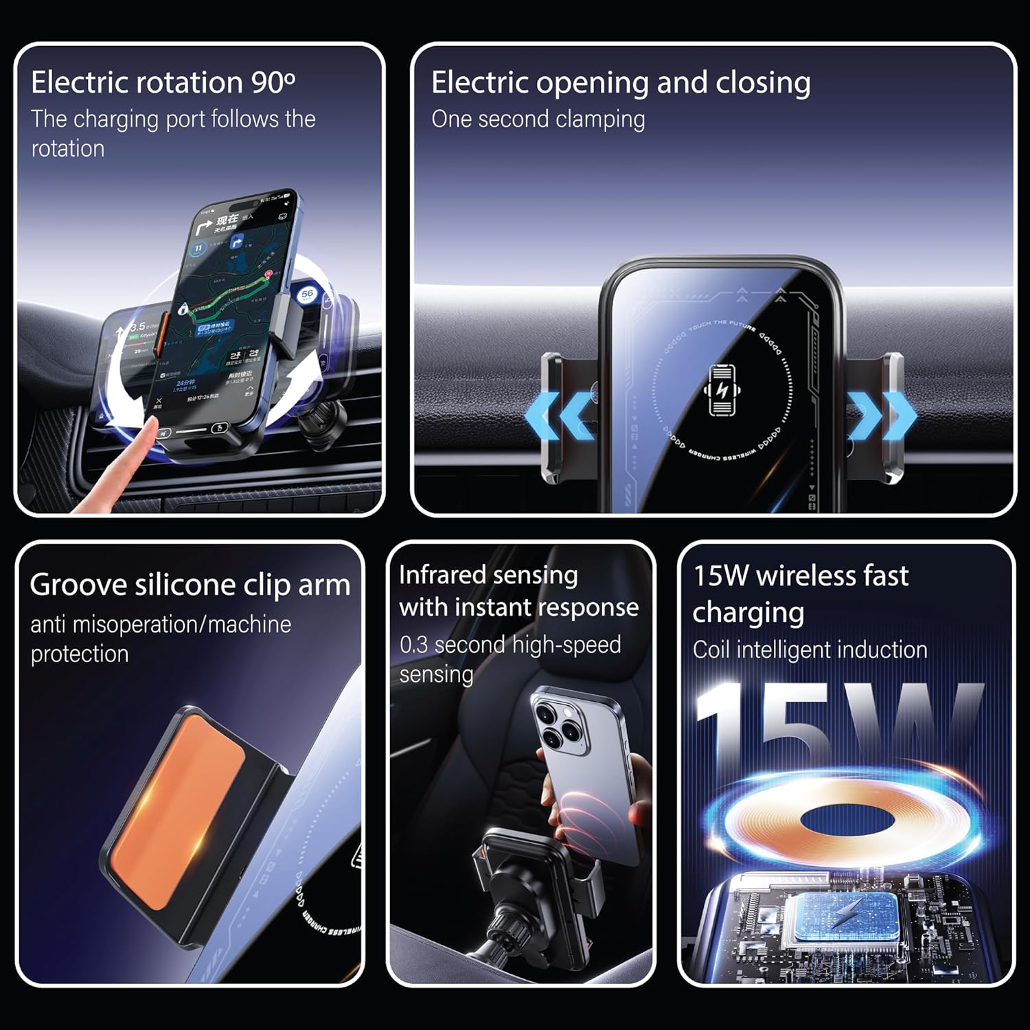 【Auto Clamping】 |【Palm Gesture Control】 | 【15W Fast Charging】 | 【90° Auto Rotation】 | 【One-Touch Operation】 | 【Built-In Battery Backup】 | 【Universal Mount Options】 | 【Dual Operation Modes】