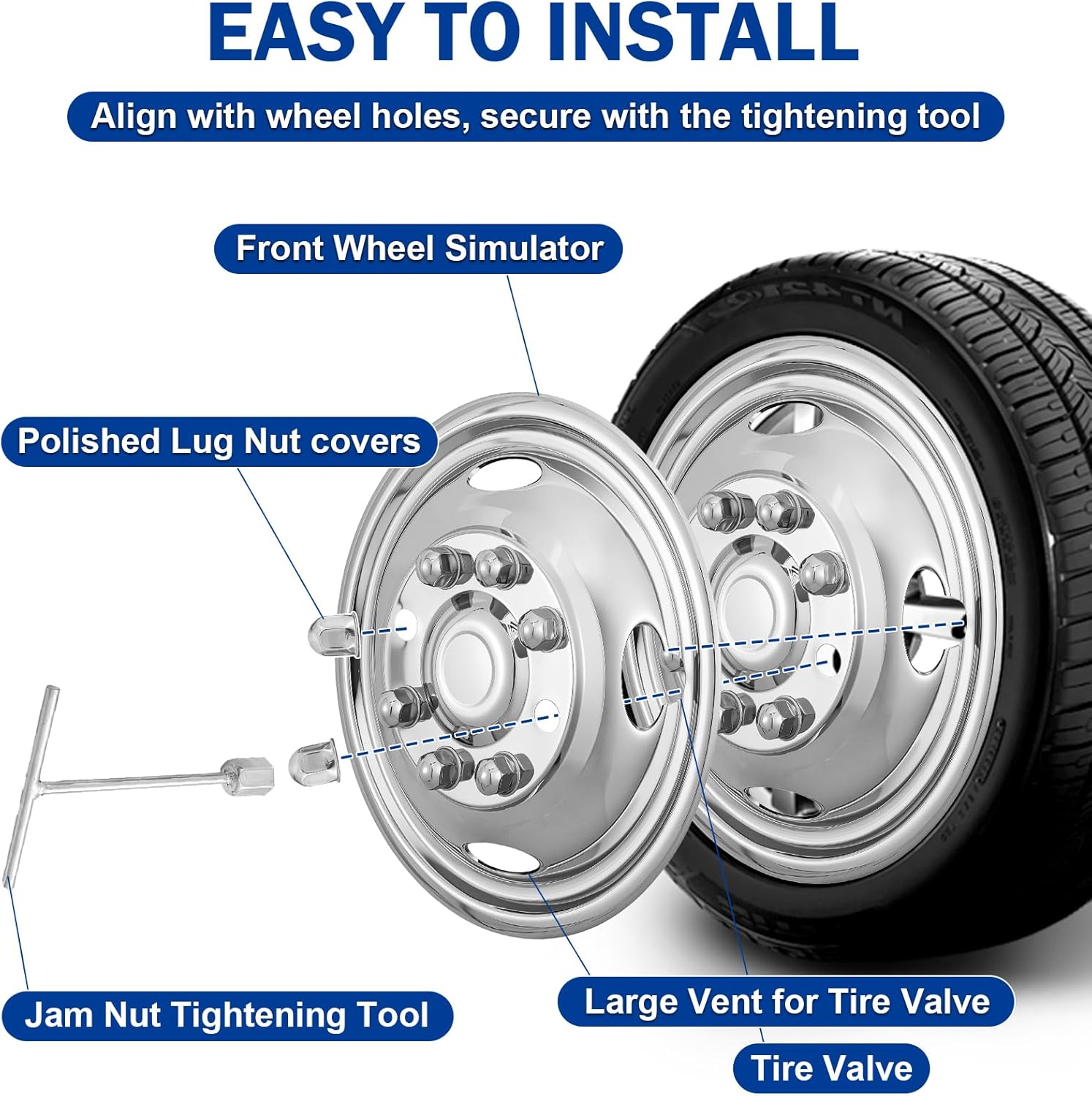 MIRROR-POLISHED STAINLESS STEEL: These wheel simulators are made of premium 304 stainless steel with a polished finish and anti-oxidation treatment. They are not only wear-resistant and durable, but also effectively resist rain, road salt, and UV damage, maintaining their pristine shine even in the harshest climates.