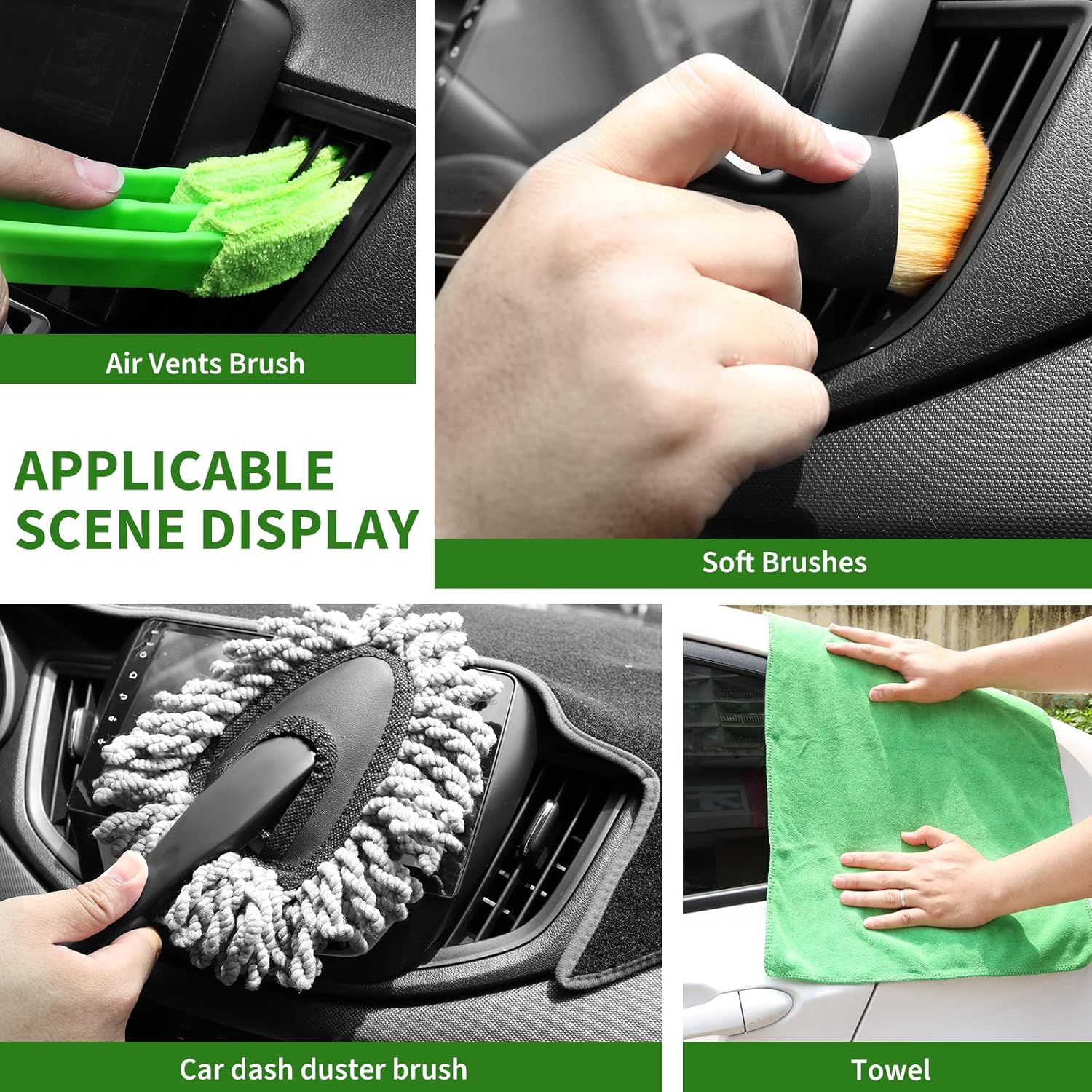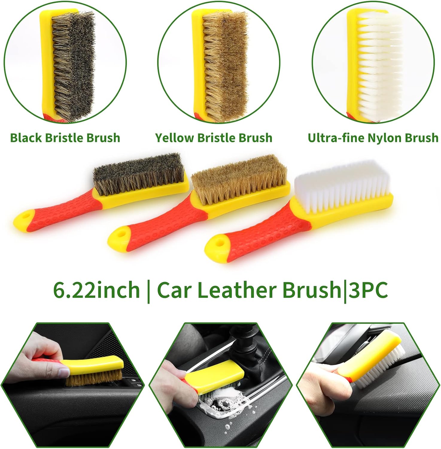 Different Size Brush Tools: 5 different sizes of detail brushes meet all your detail needs, such as small gaps, corners, lug nuts, engine compartment, etc. Bristles are soft enough to protect the surface without leaving scratches on the paint.3 different hardness leather and textile car upholstery brushes for cleaning the car dashboard, wheels, foot mats, seats, air conditioning vents and other leather and textile materials.