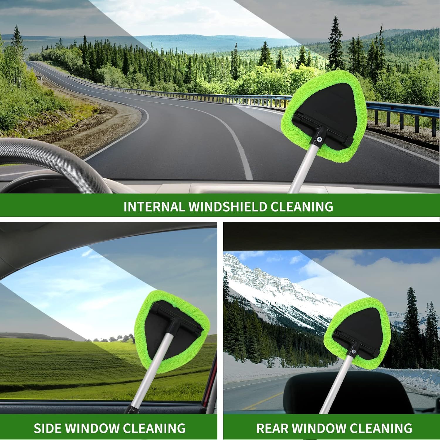 Rotatable Car Windshield Cleaner: The car window cleaner with extra long extension handle designed with 180° pivoting& rotating triangular head-helps to provide better leverage, remove troublesome gunk in the corner of windshield. Comes with 3 removable microfiber pads and a 100ml spray bottle, soft microfiber never causes streaking after cleaning.