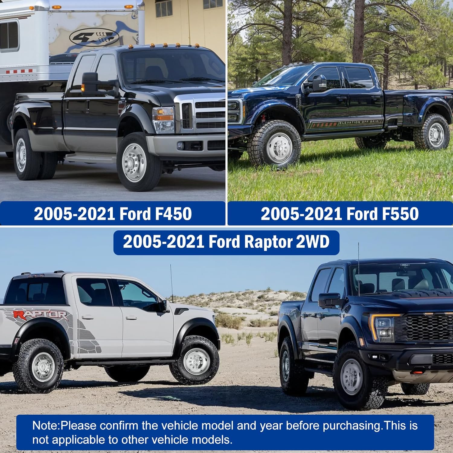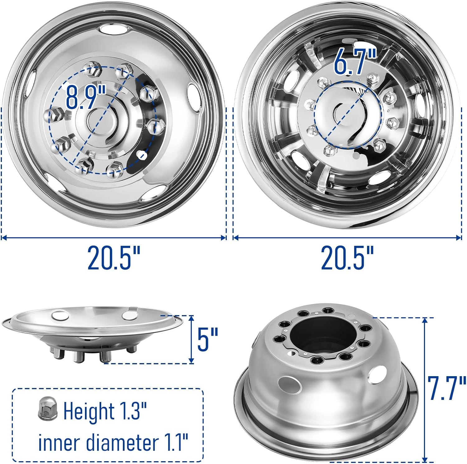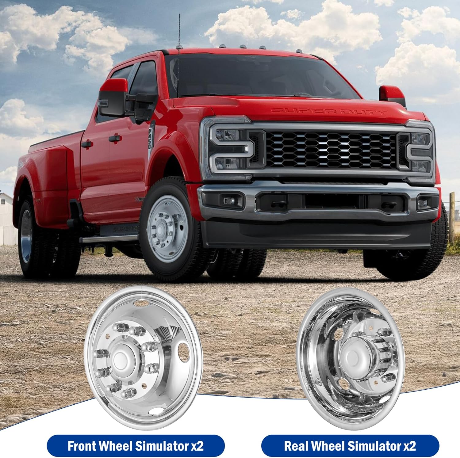 COMPATIBLE WITH: 19.5″ 10 Lug Stainless Steel Wheel Simulators for 2005-2021 Ford F450/F550. Please carefully check your vehicle’s year, model, and tire sidewall code (e.g., “R19.5”) to confirm the wheel size is R19.5 before purchasing, ensuring compatibility.