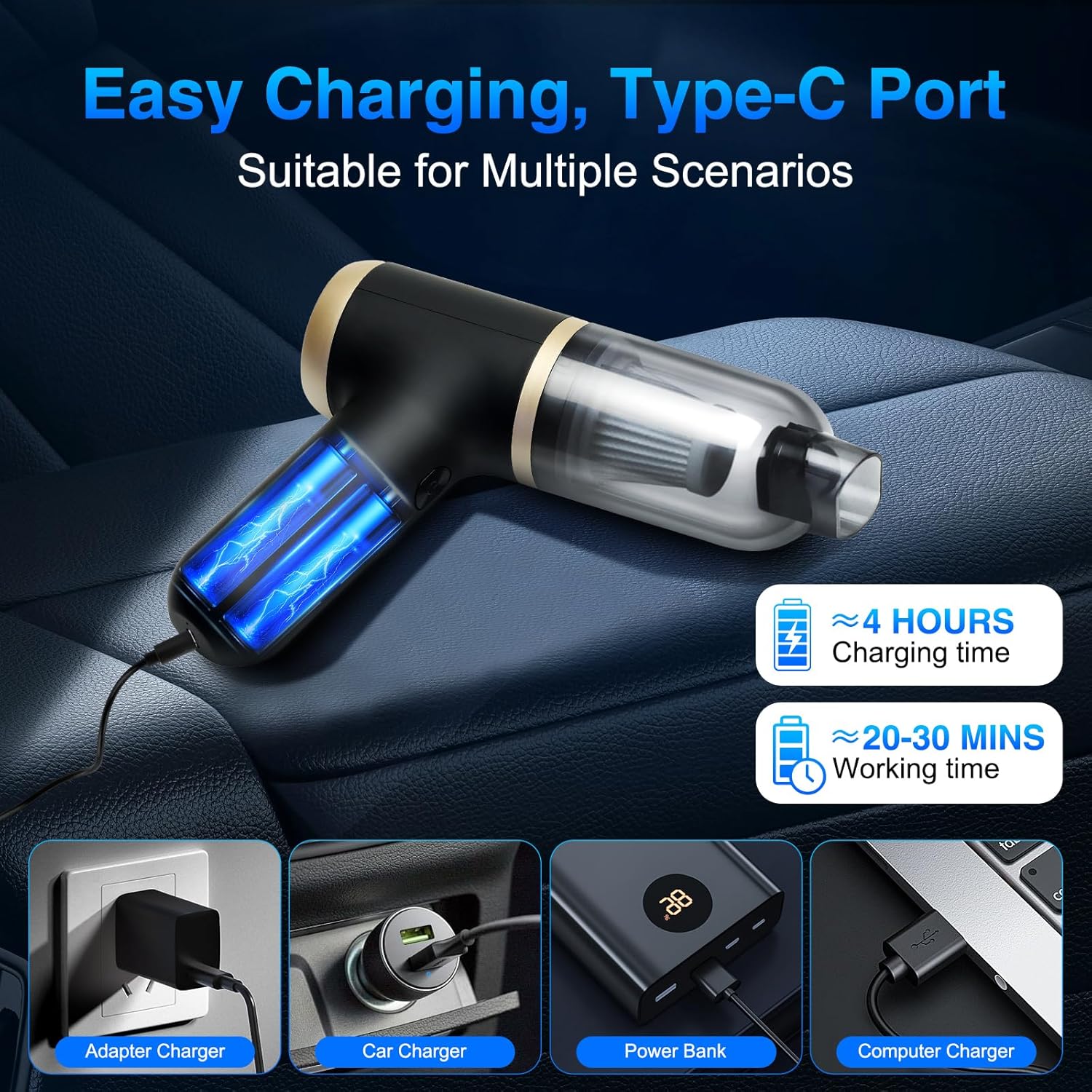 【Up to 30 Minutes of Runtime & USB-C Fast Charging: Enjoy Total Cordless Freedom】 No cords, no limits! The long-lasting battery is perfect for quick cleanups in your vehicle and home. Recharge effortlessly anywhere via the modern USB-C port—plug it into your car, laptop, or power bank for unbeatable convenience