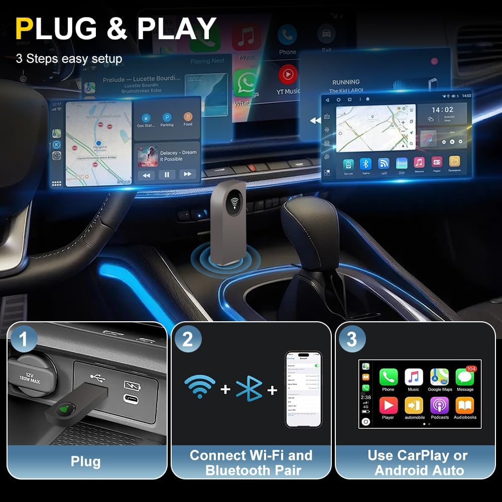 🚀 2-in-1 Wireless Upgrade & Dual-System Compatibility: Instantly converts factory wired CarPlay/Android Auto to wireless, supporting effortless switching between iPhone (iOS 10+, iPhone 6+) and Android (11+). Compatible with 1,000+ vehicle models (requires built-in wired support). Do not purchase if your car does not have CarPlay/Android auto built-in.