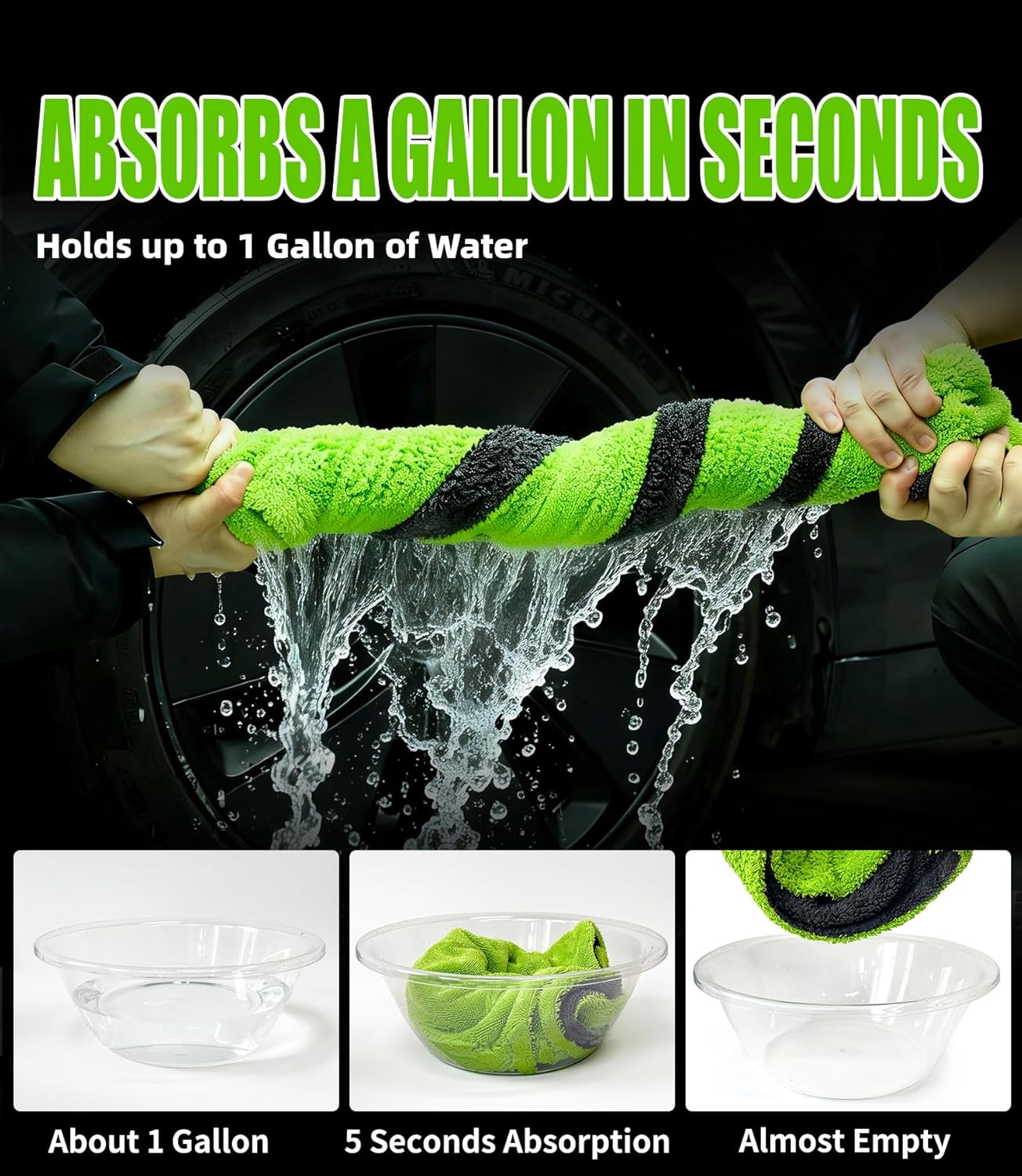 I do a lot of hand car washing myself, and I can say confidently that these are the best drying towels I’ve used so far.First, the 24×36 size is accurate, and it makes a huge difference in real use. I own many microfiber towels in smaller sizes, and none of them come close in efficiency. This towel covers a large section of the vehicle in one go, which saves time and makes drying feel much more controlled, especially on SUVs and larger panels.What impressed me most is the absorbency. I did a simple test by pouring eight standard cups of water into a container, then placing the towel into it. The towel absorbed the entire amount completely, with no leftover water. I’m including a video with my review that shows exactly how I did this. It honestly felt like it could have taken even more, but I didn’t have a larger container available to push the test further. Either way, that amount is already more than enough to remove water from the surface of any car after a wash.The towel itself is relatively heavy, around 20 ounces, and once it’s saturated it becomes very heavy, which is expected. The only real drawback is that it takes real effort to wring it out thoroughly by hand. My workaround has been simple: after washing the car, I put the towel into the washing machine on a rinse + spin cycle, then move it into the dryer. The full process takes about an hour, but it requires almost no manual effort and the towel comes out ready for the next use.Because of how much liquid it can hold, this is also a useful item to keep at home for unexpected spills or leaks where you need to soak up a large amount of water quickly.A nice bonus is that the set includes two towels, which makes the workflow much easier. While one is being spun or dried, the second can be used immediately. This set would work extremely well not only for home washing, but also for professional detailing environments where multiple vehicles are washed and dried back-to-back.Five stars without hesitation.