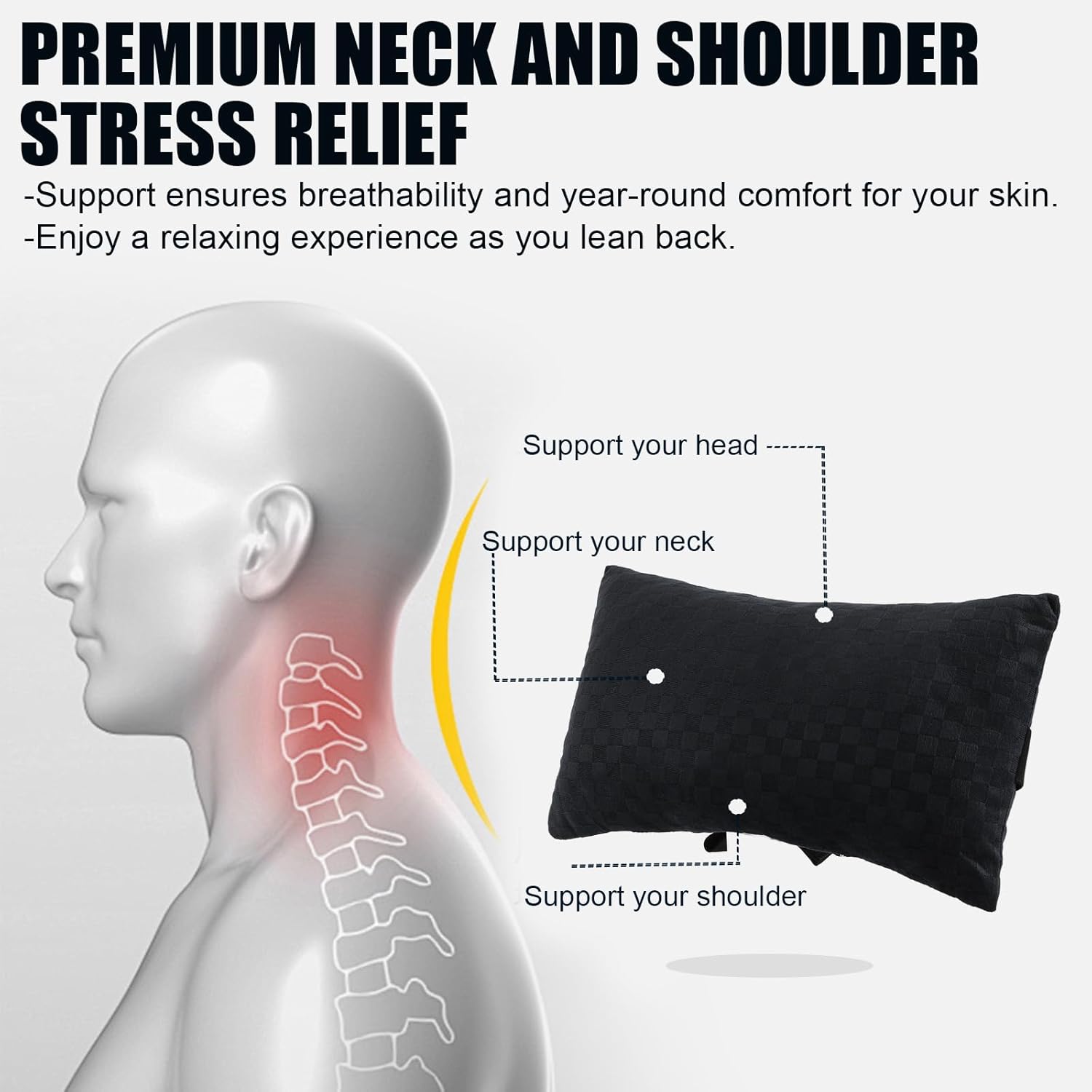 Relieve fatigue and say goodbye to the discomfort caused by sitting for long periods of time. ELASTIC ADJUSTABLE STRAPS ENHANCED NECK SUPPORT WHILE DRIVING WIDE-USE PERFECT TRAVEL COMPANION BREATHABLE, SKIN-FRIENDLY & DURABLE