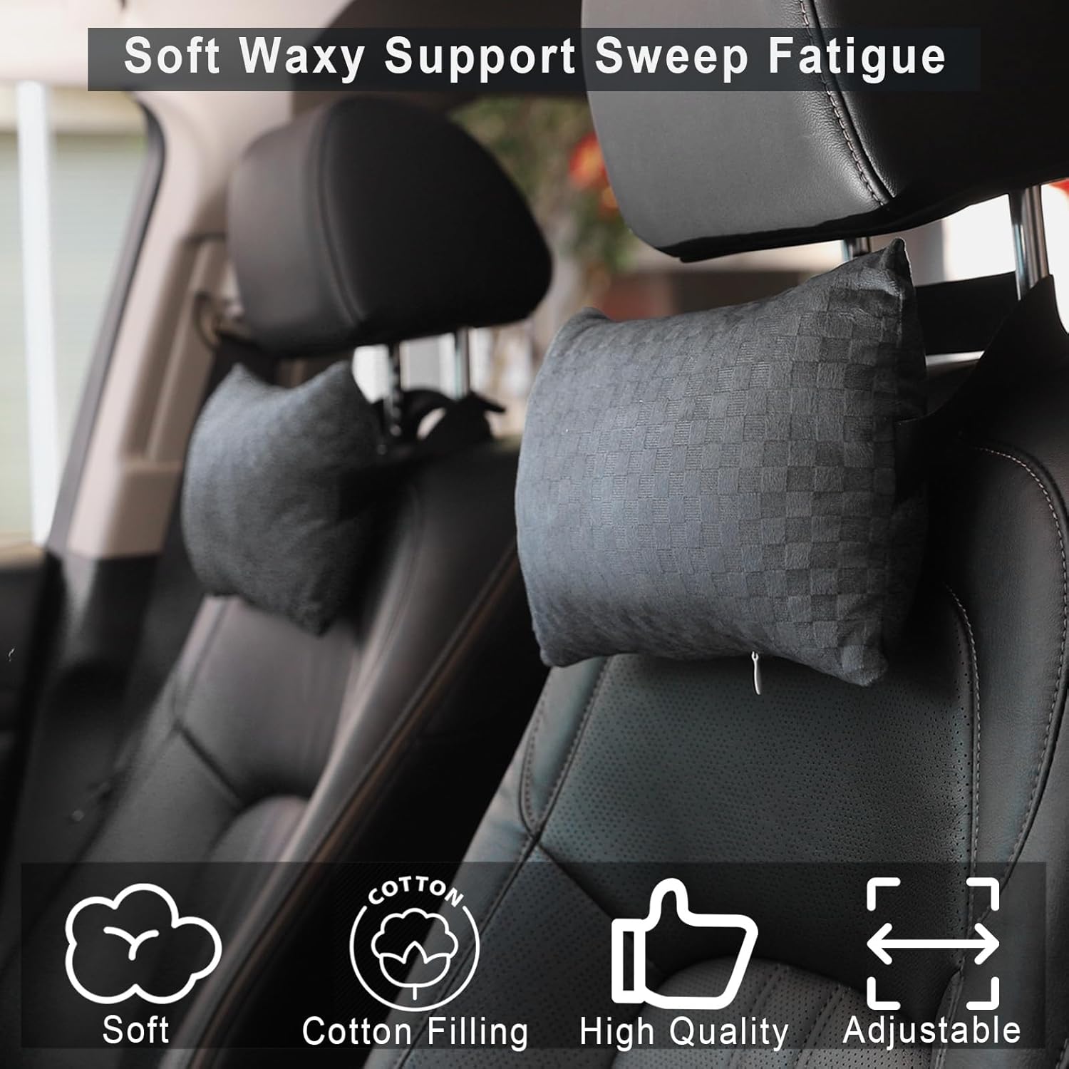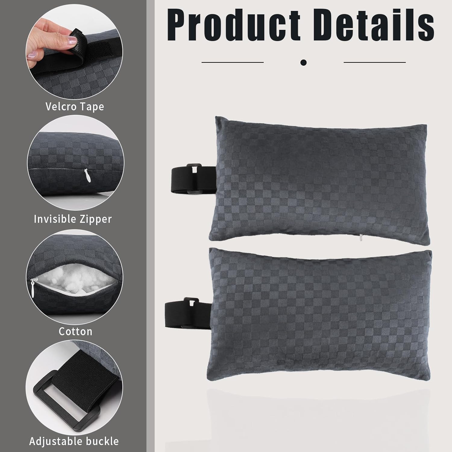 2-Pack Car Headrest Neck Pillows, 100% Cotton Fill with Adjustable Strap, Breathable Support for Driving & Travel (Gray Checkerboard)