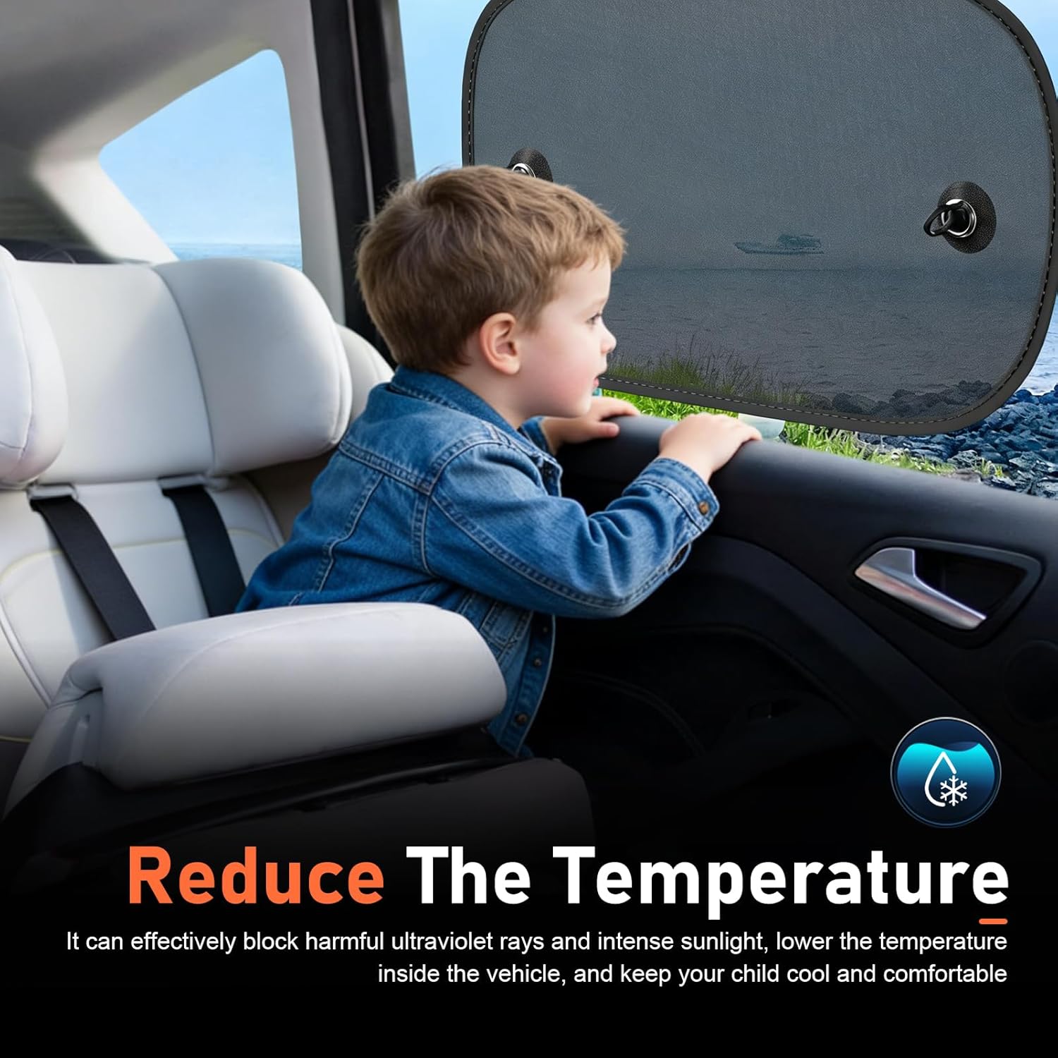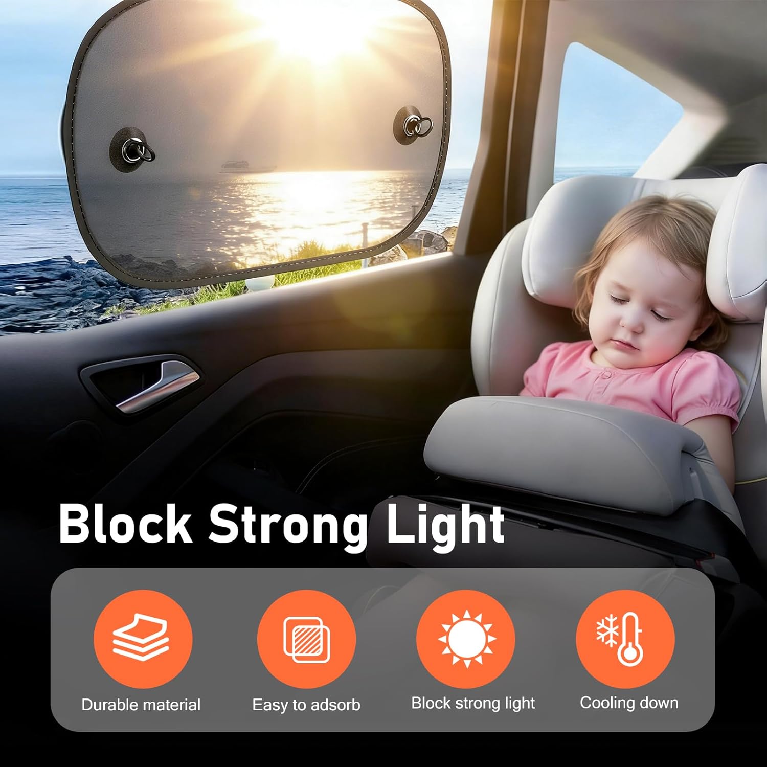 I got this two pack of window shades to help keep the sun out of the eyes of our new baby while riding in the backseat. The strong sunlight can be so harsh, and these do a fantastic job of blocking the glare and keeping the back of the car much cooler.The suction cups are very easy to use and attach securely to the glass. It only takes a few seconds to set them up or take them down, which is incredibly convenient when you are trying to get on the road quickly.They also provide a really nice amount of privacy if the baby is napping or if we are parked. The material feels durable and they fit our windows perfectly without leaving any weird gaps.