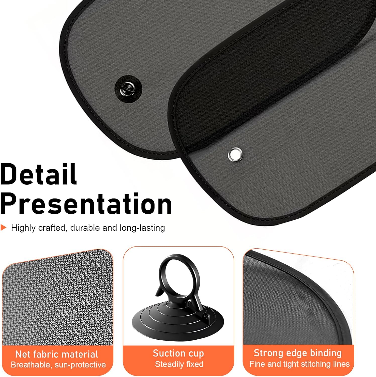 Material Features: This car sun shade set is made of high-quality nylon mesh, which is tough, dense and tear-resistant. It is not easy to break or deform, durable for long-term use. The mesh material is breathable and light-transmitting, which can block sunlight without blocking the view outside the car.