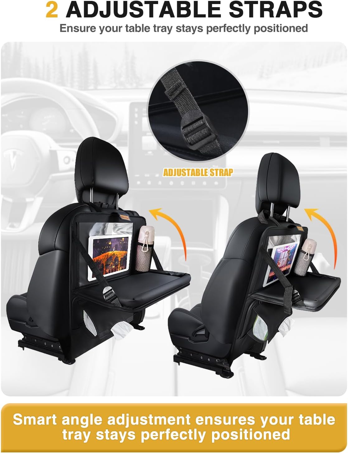 Dual-Side Adjustable Tabletop : The car seat tray has stable dual-side adjustable tabletop, the tilt angle can be adjusted via dual-side adjustment cords, ensuring stable operation and even force distribution.
