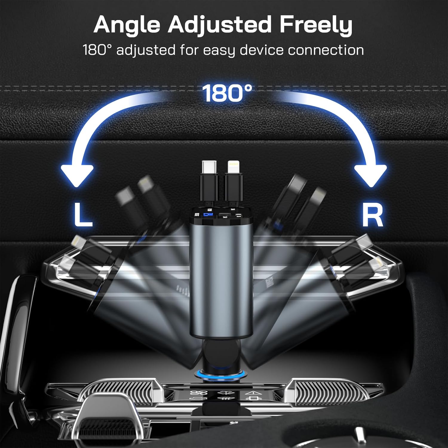【Flexible Adjustment of Length and Angle】The 4 in 1 car charger comes with two retractable cables that can be pulled out to a range of 31.5inch/80cm, and it retract back inside automatically for storage, eliminate the clutter in the car. For facilitating convenient control and better use experience, our upgraded i Phone 16 15 car charger head can be adjusted freely, up to 180° from left to right, you can easily charging your devices from the backseat – great car essentials for Honda Accord/Civic Accessories, and even crv 2025 Accessories users and Jeep Wrangler/Ford F150 owners.