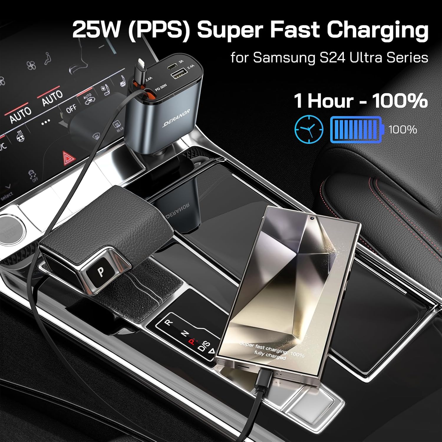 【PD/PPS Super Fast Charging】 The retractable car charger type c cable adopts PD/PPS fast charging technology with maximum power of 30 Watt, Support Super Fast Charging to provide compatible with Samsung devices. Super fast charge for Samsung Galaxy S25 Ultra/S25/S24 Ultra/S24/S23 Ultra from 0% to 100% in just about 1 hour, much higher speed than 15W charger. Fast charge your i Phone 17/16/15 series up to 70% in just about 35mins, much faster than 20W USB charger.