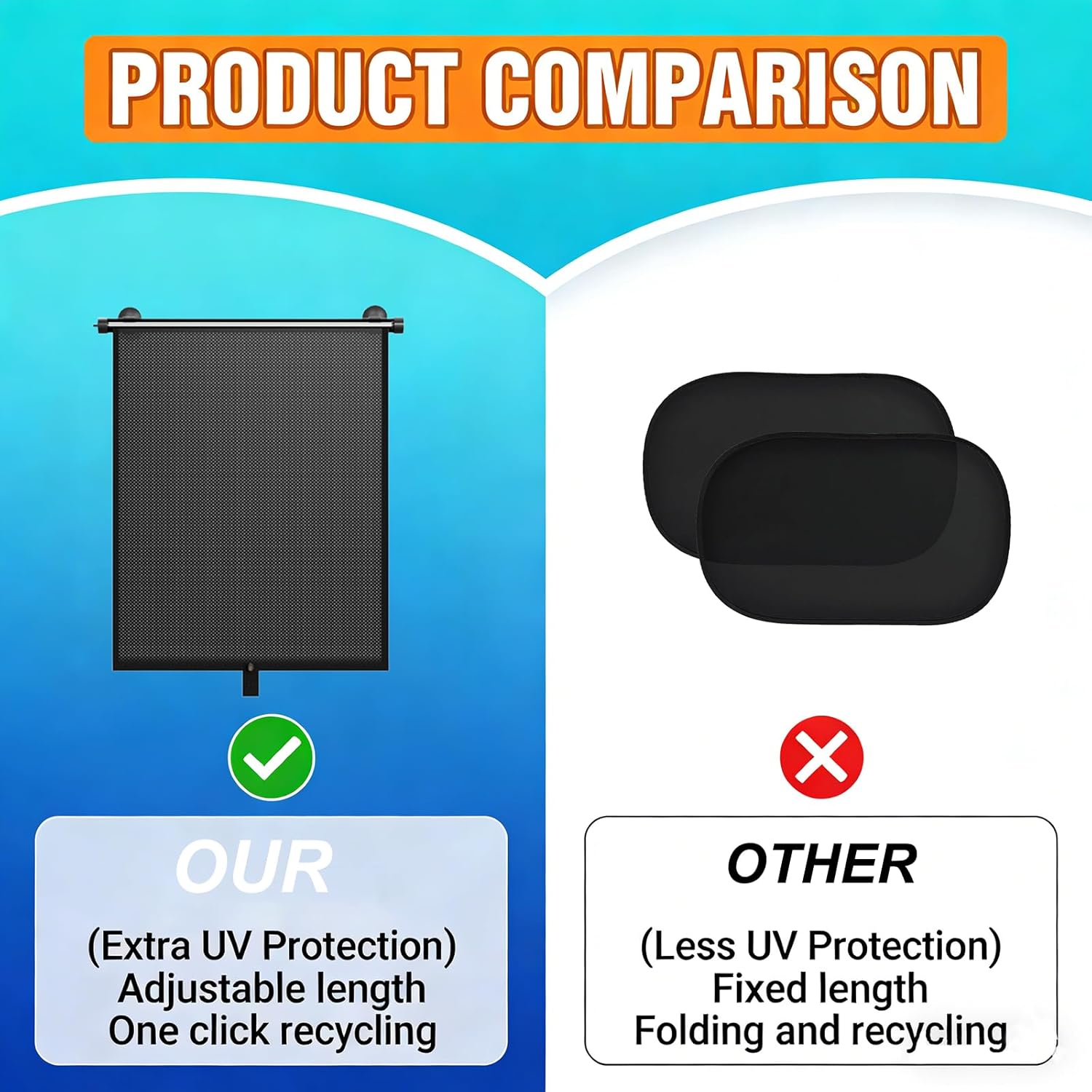 Easy to install: Equipped with 6 suction cups, our window sun shade for car installs in seconds—just clean the side window, press the suction cups firmly, and pull down to adjust length. These car shades for side windows feature a one-touch rewind button for easy folding, making them a convenient choice for busy parents who need a no-fuss car sun shade that stays securely in place.
