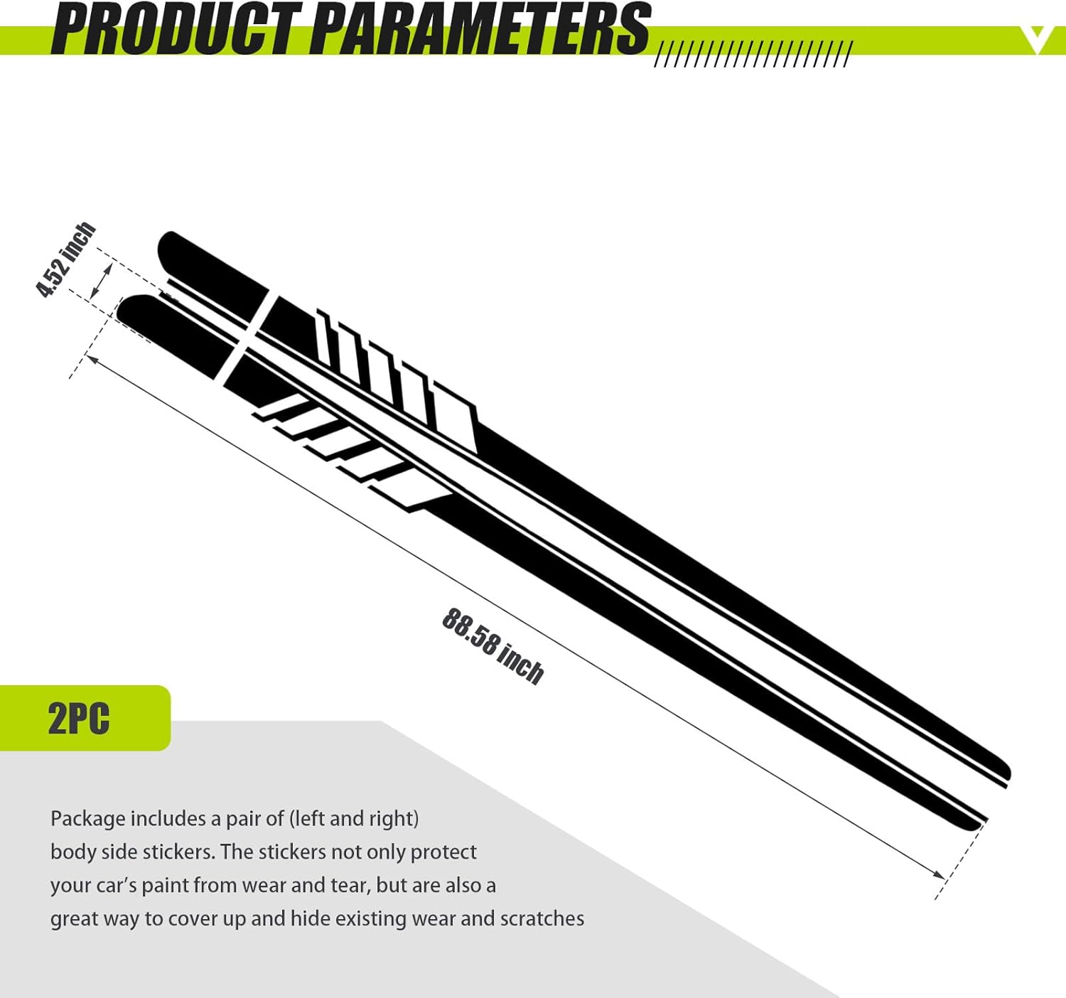 Packing List: Package contains 2 pieces of car side body decals, size: 225cm x 11.5cm/88.58″ x 4.52″. They are pre-cut and designed according to the shape and size of the body to ensure a precise fit to the side of the vehicle.