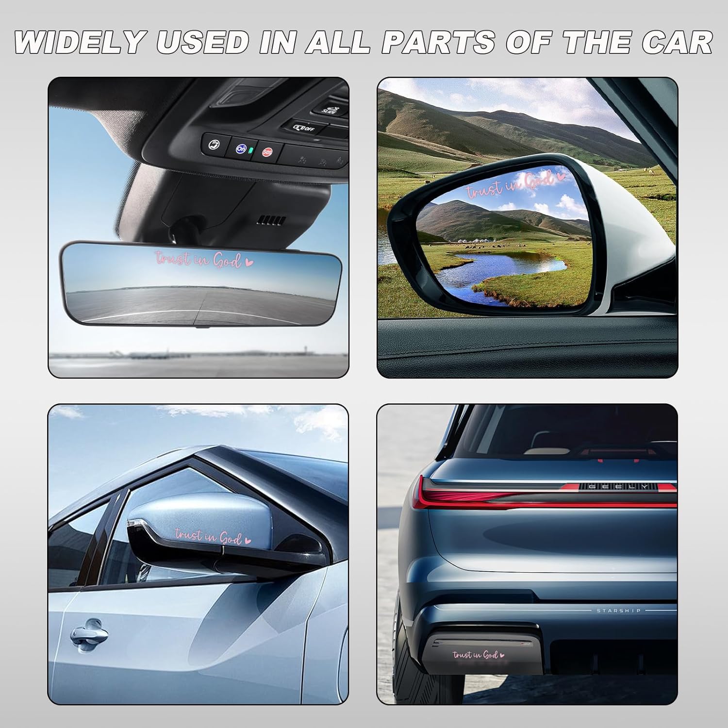【Excellent Function】: Our “Trust in God” rear view mirror decals have a powerful adhesive backing that adheres securely. What’s more, it is removable, which can be peeled off easily without leaving any sticky residue, ensuring a clean and hassle-free removal process.