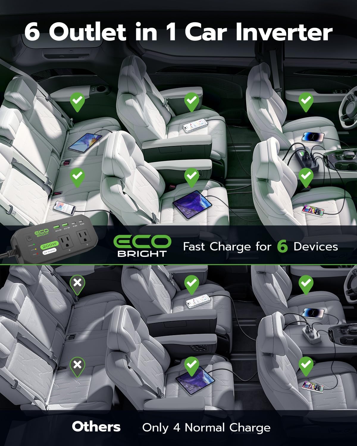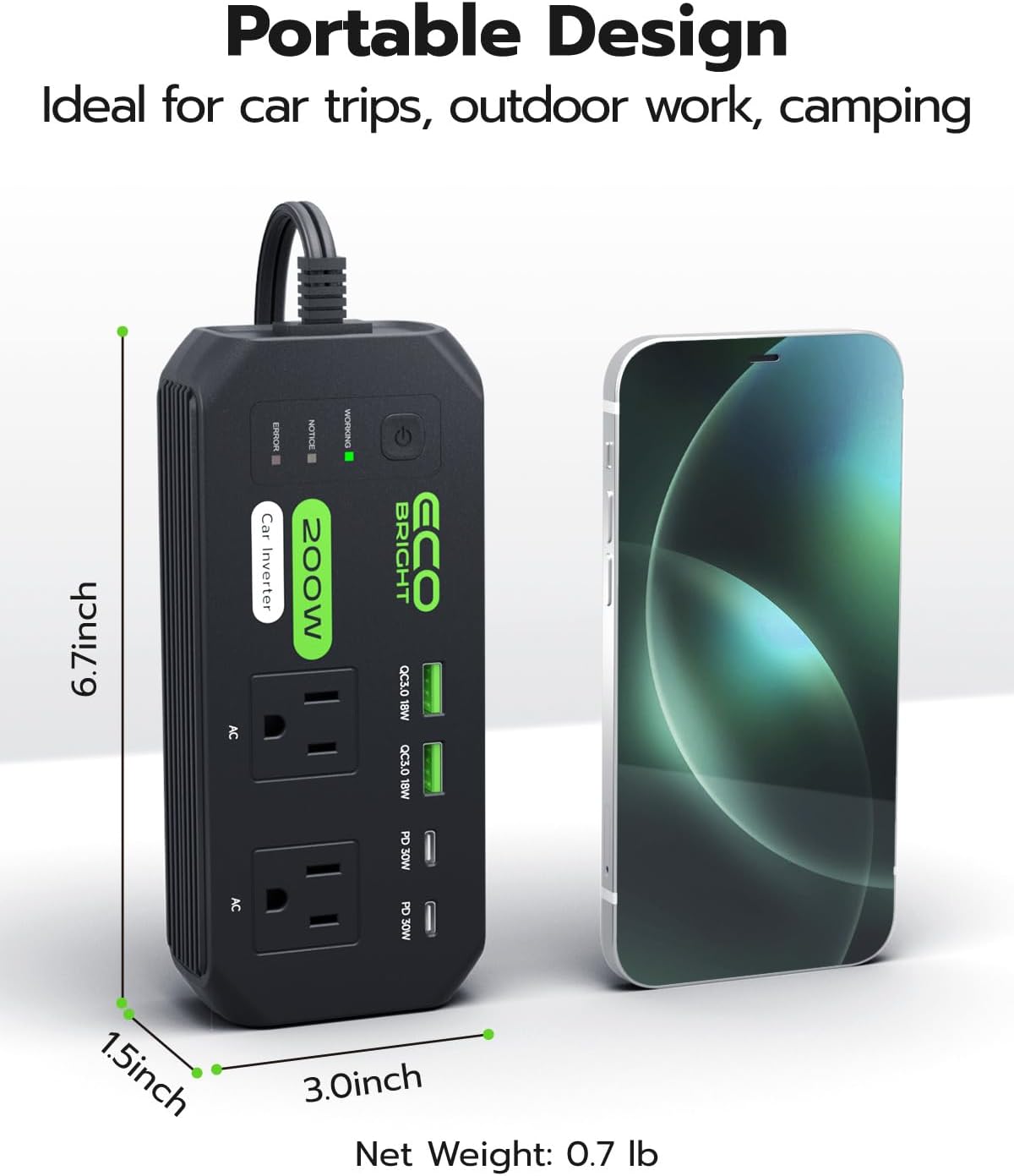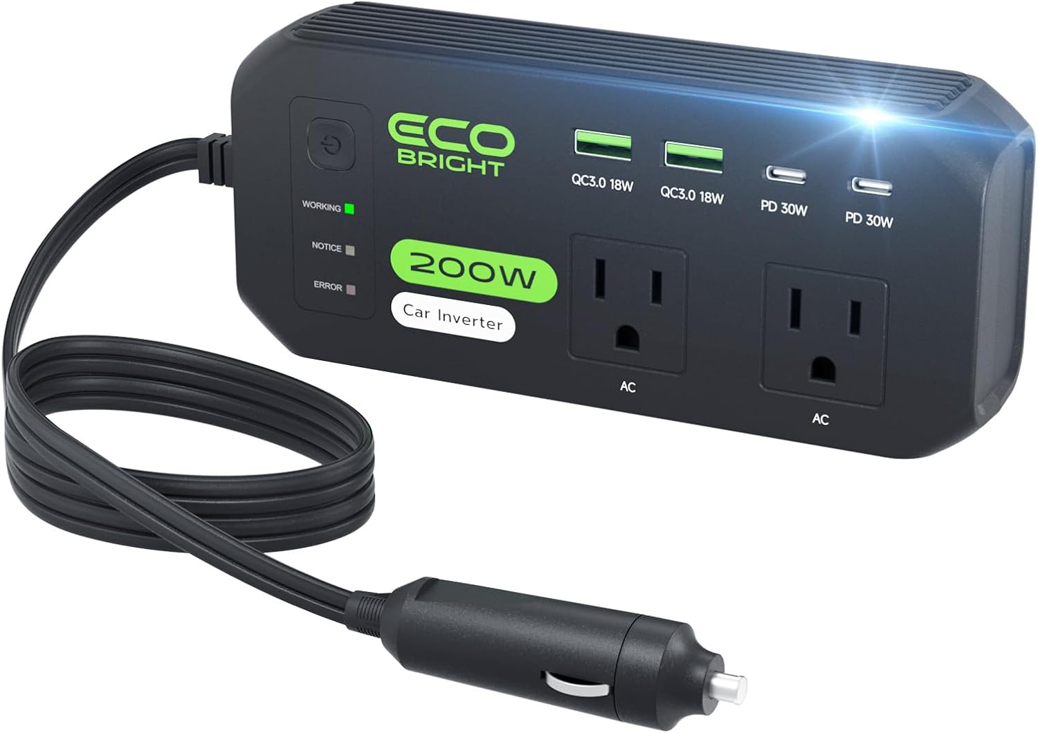 I recently picked up the EcoBright 200W Car Power Inverter, and it’s been a total game-changer on the go. With dual AC outlets and quick-charge USB ports (30W USB-C and 18W USB-A), I can power up my laptop, phone, and even a small fan simultaneously. It’s compact enough to stash in my glove box, and the built-in cooling fan keeps it running smoothly and quietly.Setup is plug-and-play – just connect to the 12V socket and you’re good to go. I appreciate the LED status light and the reliable safety protections against overheating, short circuits, and overloads. Whether I’m driving cross-country or parked at a campsite, this inverter delivers consistent power with zero hassle. Five stars for reliability, portability, and smart design!