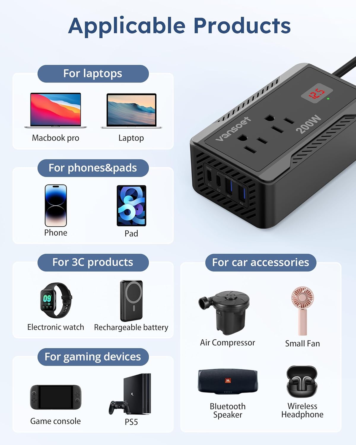 【200W CAR INVERTER FOR VEHICLES】Car inverter with 2 USB-C & 2 USB-A ports & 2 AC outlets, Inverter upgraded to DC 11-17V Suitable for Tesla, There is an input voltage display screen and operation indicator light on the inverter.