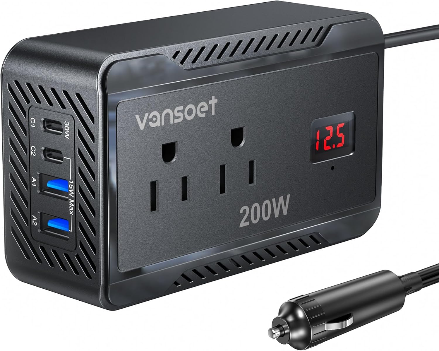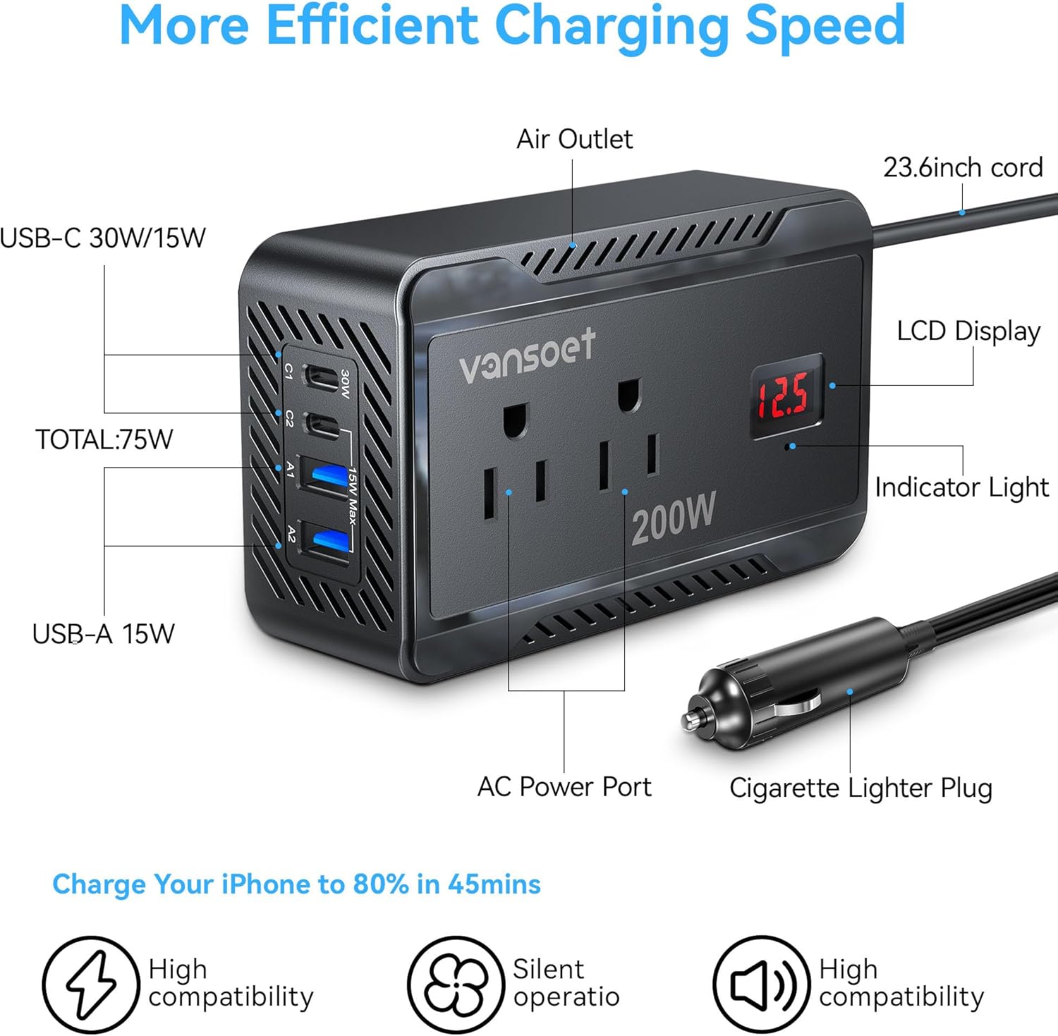 8 reviews for 200W Car Power Inverter DC 12V to 110V AC Converter with [PD 30W & 15W] Fast Charging USB C/3.0A Dual USB Charging Ports, Car Outlet Adapter for Phone, Laptop on Road Trip (Black)