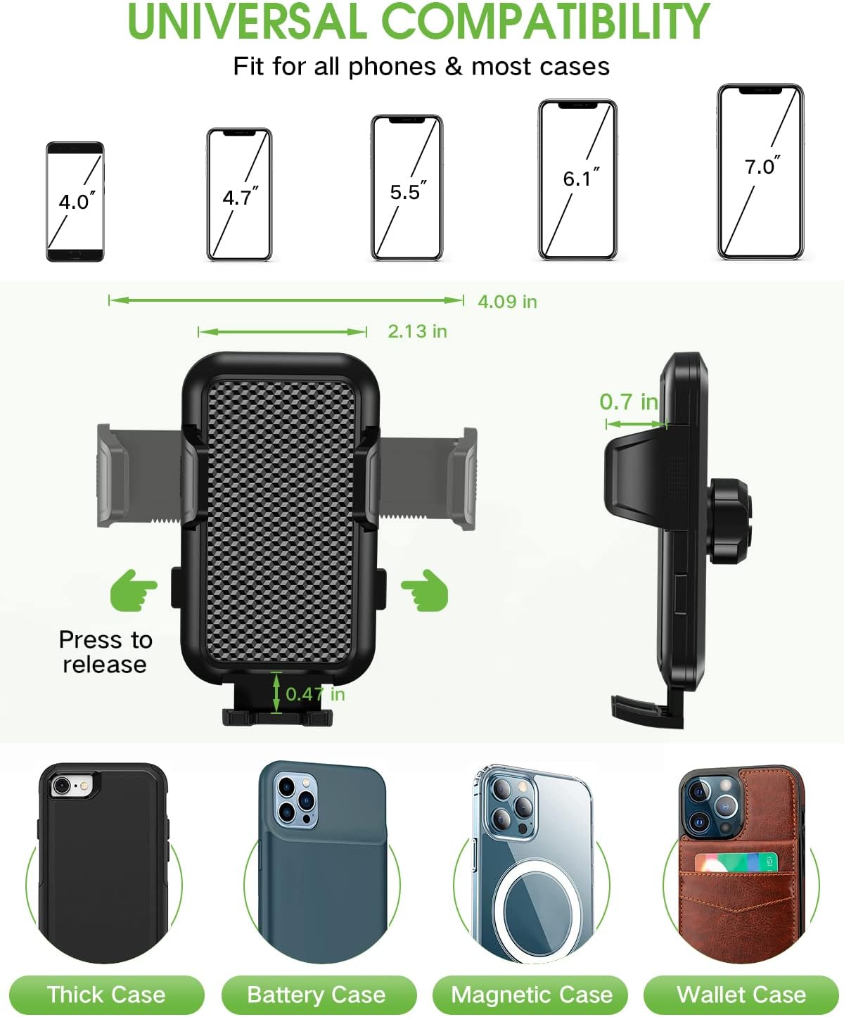 ✅ [Fit All Phones & Thick Case Friendly]: Our car phone holder with adjustable side arms and foot fits all cellphones with 4-7 inches screen, especially big phones. Compatible with iPhone 16 Pro Max/iPhone 16 Pro /iPhone 16/ iPhone 15 Pro Max/iPhone 15 Pro /iPhone 15/iPhone 14 Pro Max/ 14 Pro/ 14 Plus/ 14/ 13/ 13 mini/ 13 pro/ 13 pro max/ 12/ 12 mini/ 12 pro/ 12 pro max/ 11/ 11 Pro/ 11 Pro Max/ XS/ XR/ XS Max/ X/ Samsung LG, Google, Nokia and all phones. Any type of phone with a thick case(depth <0.7 inches) can fit in this cup phone holder mount