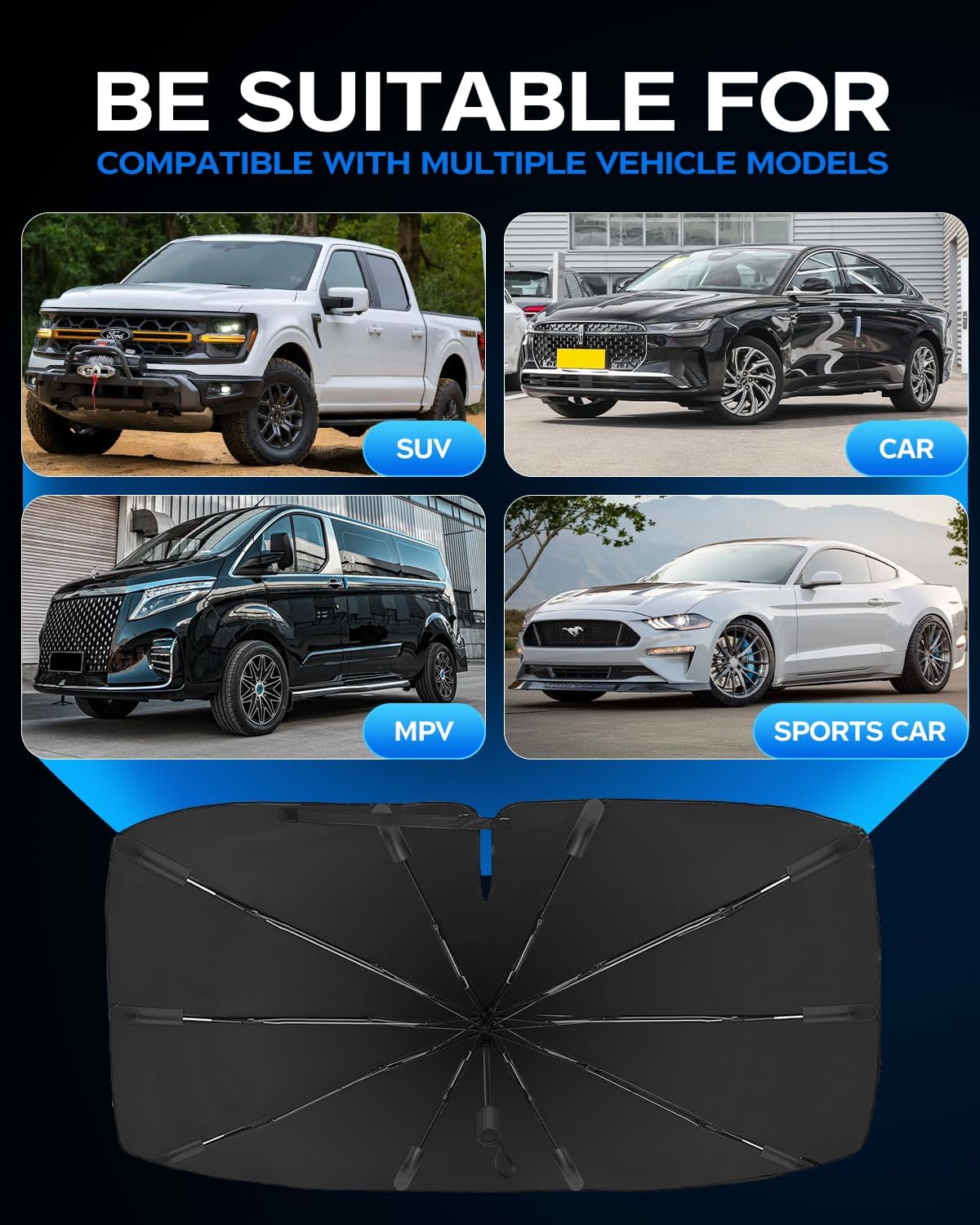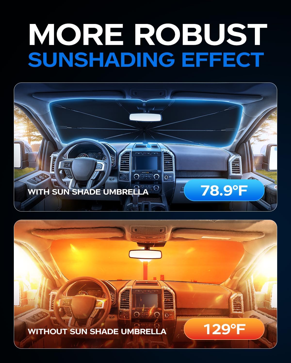 Switching from traditional, bulky sun protectors to this umbrella-style windshield shade has been a revelation; it earns a five-star rating for its superior ease of use, as deployment and storage take mere seconds. Unlike flimsy alternatives, this shade delivers a perfect barrier across the entire front glass, ensuring maximum heat and UV blockage for the interior, making it a lifesaver in the melting heat of a Miami summer. Best of all, once opened, the robust frame keeps the shade securely and perfectly anchored against the window perimeter, eliminating any frustrating sag or shift, and reliably keeping the car interier cool without needing extra support from the visors.