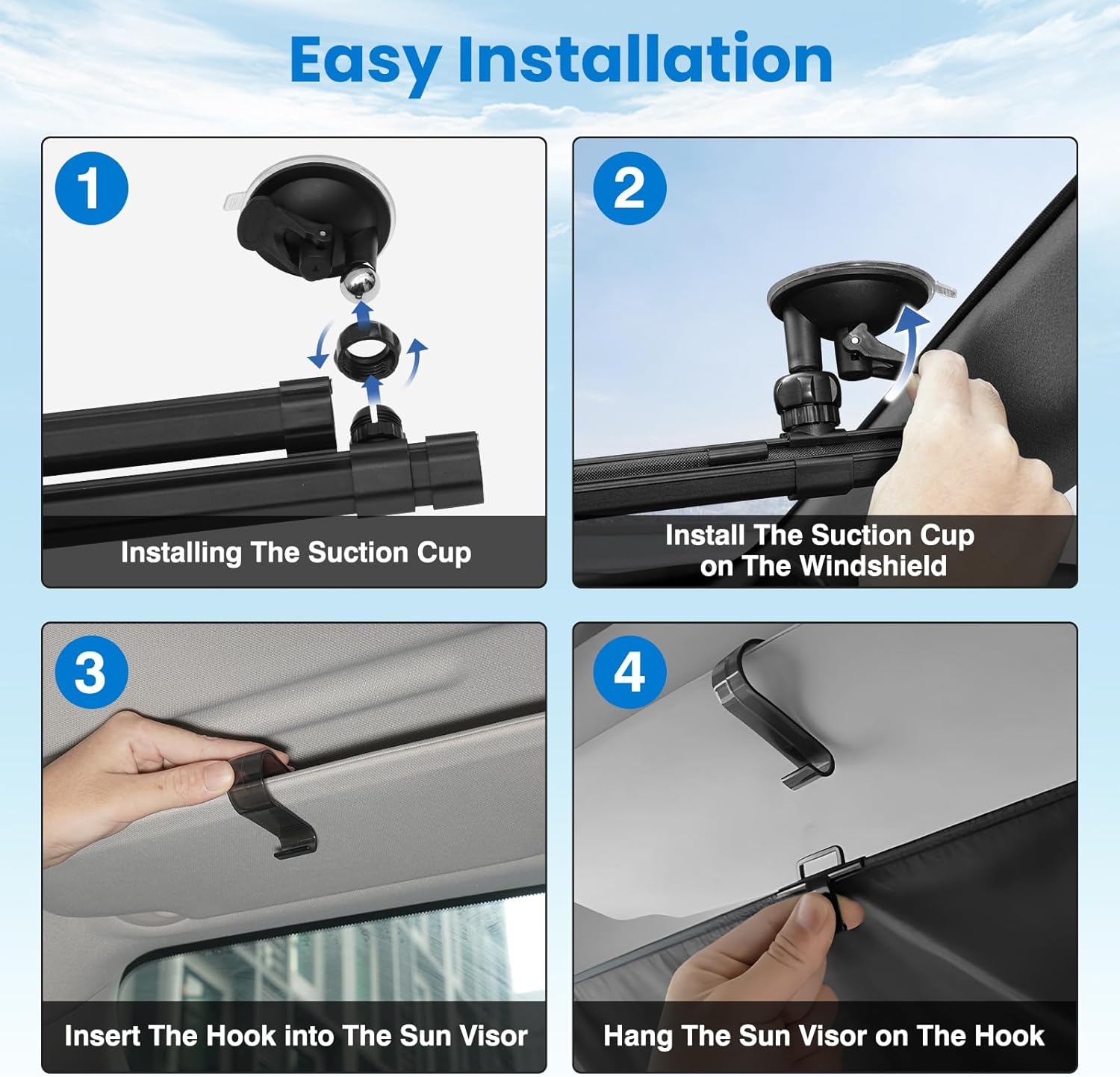 【Tool-Free Easy Installation】 Install in just 2 minutes with no tools required! ① Attach suction cups to the bracket; ② Adjust the sun shade size; ③ Stick the suction cups to the windshield; ④ Hook it to your sun visor.