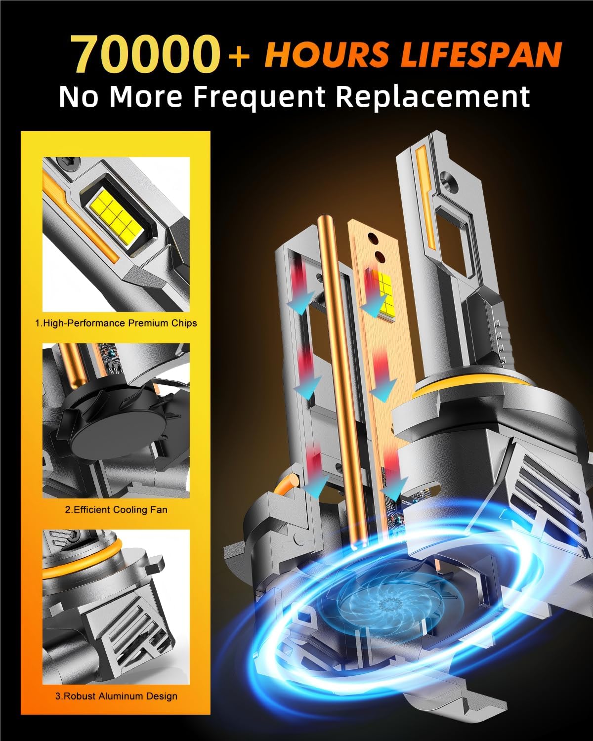 【Unrivaled Power and Performance】Our 9012 light bulbs combo feature an unparalleled cooling system. Crafted with precision from premium aviation-grade aluminum, complemented by a thermostatic copper plate and a high-speed 20,000RPM cooling fan. This ensures swift heat dissipation, maintaining stable and uninterrupted operation. With an extended average lifespan of 70,000 hours per light bulb, you can count on reliable performance mile after mile.