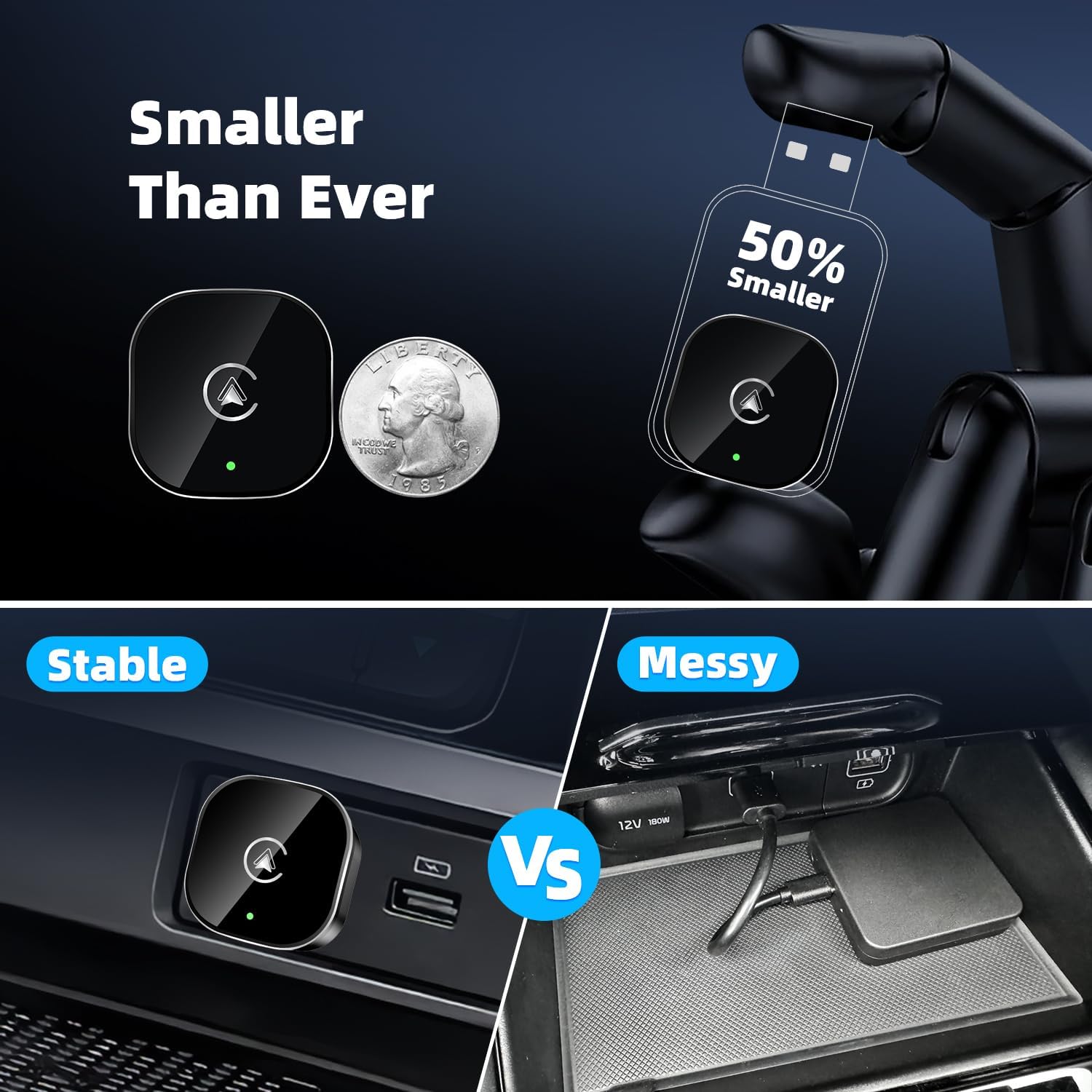 Mini Size/ Lightweight: 50% Smaller and lighter than similar carplay adapter weight only 1.4 Ounces. Length 1.1inch * Width 0.4inch * Height 1.1inch makes it so easy to carry with amd save space in your car.This car play wireless adapter fits perfectly in narrow car slots. Includes USB-A and Type-C port for all usage scenarios.